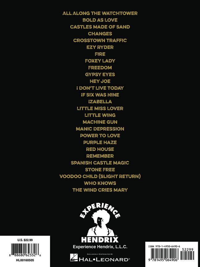 La collection ultime de classiques de Hendrix pour basses avec 27 transcriptions, dont : All Along the Watchtower - Castles Made of Sand - Crosstown Traffic - Fire - Foxey Lady - Hey Joe - Little Wing - Manic Depression - Purple Haze - Red House - Spanish Castle Magic - Voodoo Child (Slight Return) - The Wind Cries Mary - et bien d’autres.