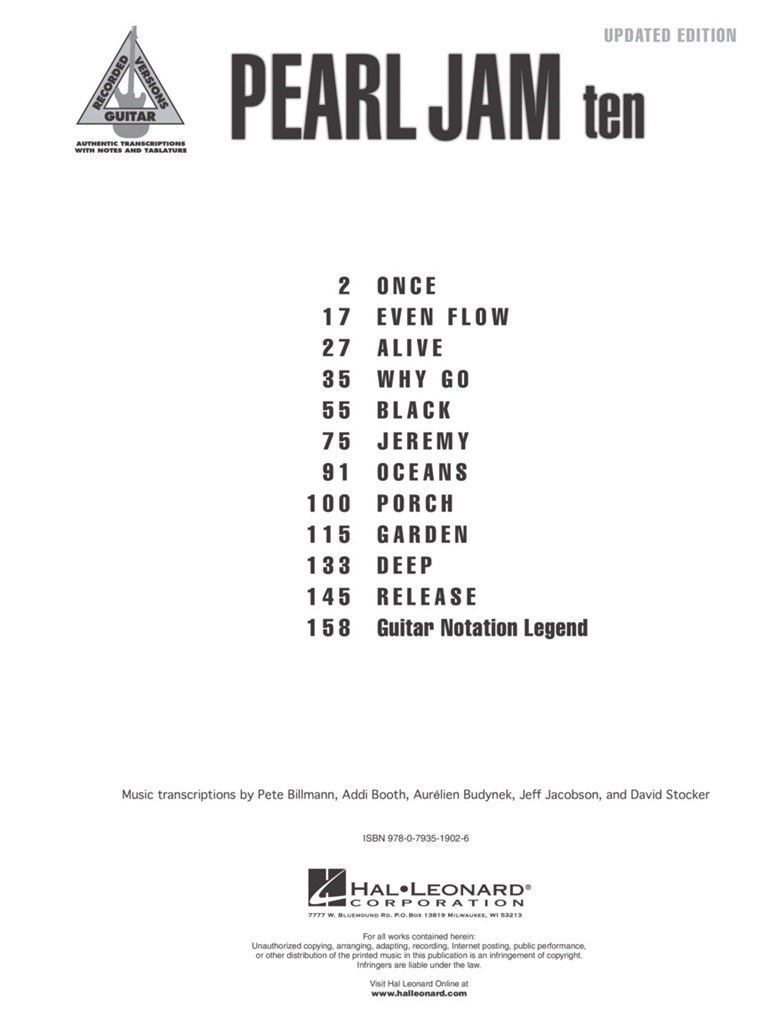 Cette édition révisée propose de nouvelles transcriptions note pour note avec tablature pour les 11 chansons du premier album remarqué de Pearl Jam : Alive · Noir · Profond · Flux régulier · Jardin · Jeremy · Océans · Une fois · Porche · Sortie · Pourquoi y aller.
