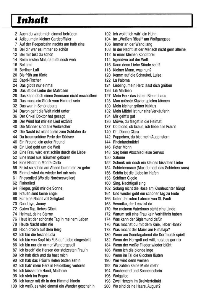 Auch du wirst mich einmal betrügen Adieu, mein kleiner Gardeoffizier Auf der Reeperbahn nachts um halb eins Bei dir war es immer so schön Bei mir bist du schön Beim ersten Mal, da tut’s noch weh Bel ami Berliner Luft Bis früh um fünfe Capri-Fischer Das gibt’s nur einmal Das ist die Liebe der Matrosen […]