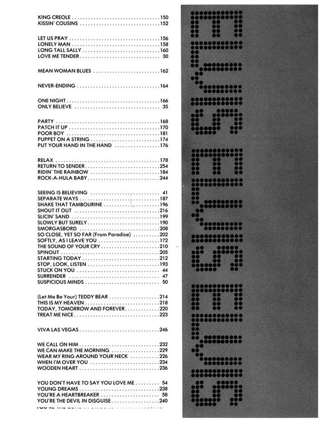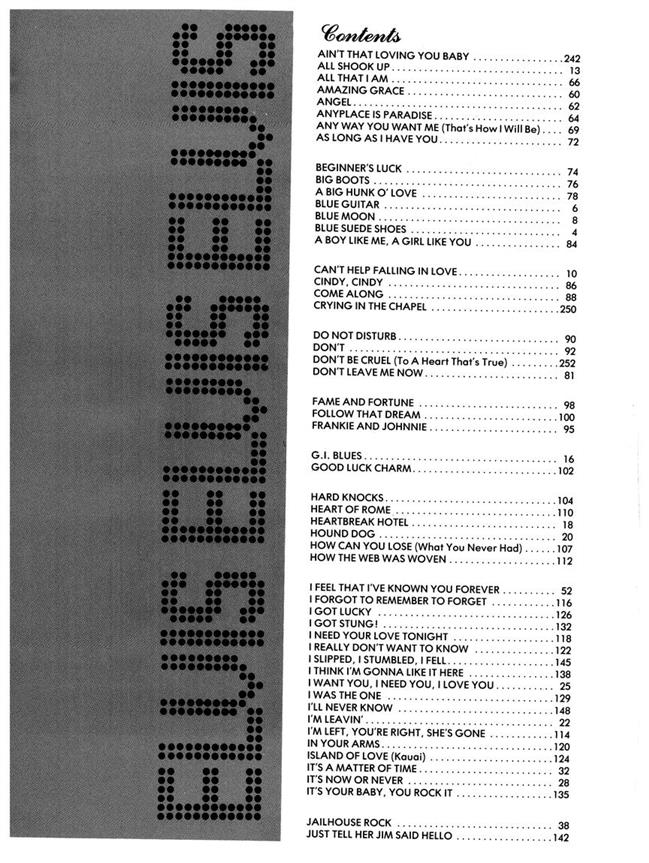 100 de ses hits immortels, y compris: All Shook Up o Amazing Grace o Blue Suede Shoes o Crying in the Chapel o Heartbreak Hotel o Suspicious Minds