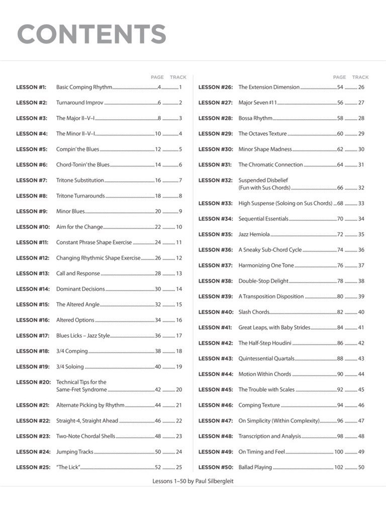 Une grande variété de styles et de techniques de guitare jazz sont couverts, y compris: modes, arpèges, Comping base, blues Comping, improvisation d'exécution, notes de l'accord, la substitution de triton, séquences échelle, Pentatonics, les accords sus, l'harmonie polyphonique, et bien plus encore!