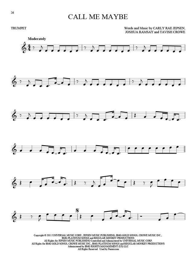 This massive collection will keep instrumentalists busy with 101 pop hits to learn and play! Songs include: All About That Bass - All of Me - Brave - Breakaway - Call Me Maybe - Clocks - Fields of Gold - Firework - Hello - Hey, Soul Sister - Ho Hey - I Gotta Feeling - I Will Remember You - Jar of Hearts - Love Story - 100 Years - Roar - Rolling in the Deep - Royals - Say Something - Shake It Off - Smells like Teen Spirit - Uptown Funk - When You Say Nothing at All - and more.