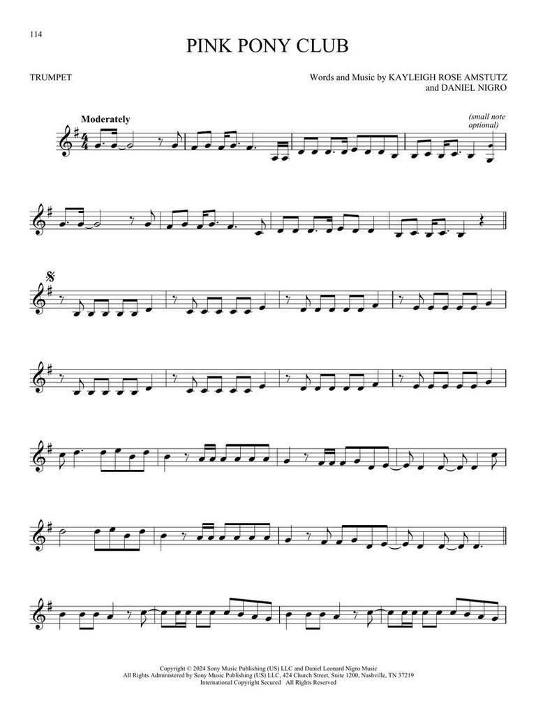 Packed with today's biggest chart-toppers and viral favorites, 101 Top Hits is the ultimate collection for beginner and intermediate alto sax players! This easy-to-play collection features simplified rhythms, accessible key signatures, and comfortable note ranges – perfect for players looking to build confidence while having fun! You'll love performing favorites like “Anti-Hero,” “Birds of a Feather,” “Espresso,” “Pink Pony Club,” and many more. Whether you're practicing at home, performing for friends, or just playing for pure enjoyment, 101 Top Hits makes it easy to sound great and stay inspired from the first note to the last.