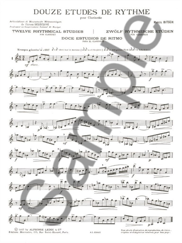 Born in Toulouse, Marcel Bitsch (1921-2011) went on to study at the Paris Conservatoire before becoming a professor of counterpoint at the institution. As an exceptionally versatile composer, Bitsch has composed orchestral works, chamber works and numerous pieces and studies for wind instruments. 12 Rhythmical Studies comprises unique studies covering all technical aspects asked of Clarinet players. Suited to advanced-level clarinetists, Bitsch 's 12 Rhythmical Studies for Clarinet covers a variety of musical aspects, including articulation, complex rhythms, range, scales and dynamics. The variety of musical elements included in this Marcel Bitsch study book is outstanding, creating a necessary addition to the Clarinet player's progression.