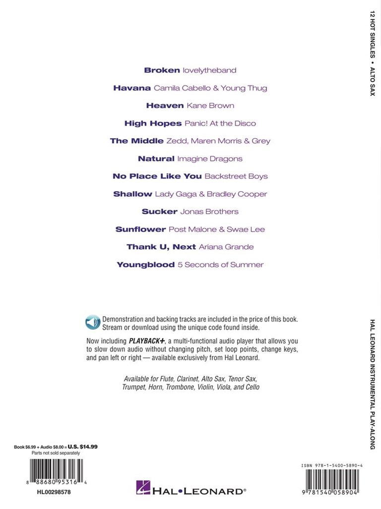 A dozen contemporary hits are included in this collection perfect for budding instrumentalists. It features online access to audio demonstration and backing tracks for download or streaming to help you hear how the song should sound then play along and sound like a pro! Songs include: Broken (lovelytheband) · Havana (Camila Cabello) · Heaven (Kane Brown) · High Hopes (Panic! At the Disco) · The Middle (Zedd, Maren Morris and Grey) · Natural (Imagine Dragons) · No Place like You (Backstreet Boys) · Shallow (Lady Gaga and Bradley Cooper) · Sucker (Jonas Brothers) · Sunflower (Post Malone and Swae Lee) · thank u, next (Ariana Grande) · Youngblood (5 Seconds of Summer).