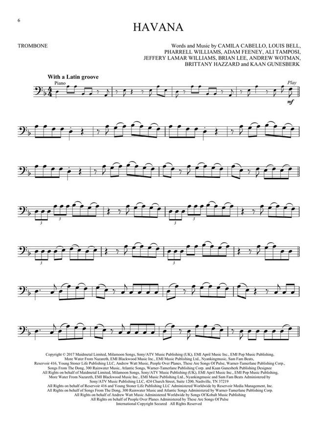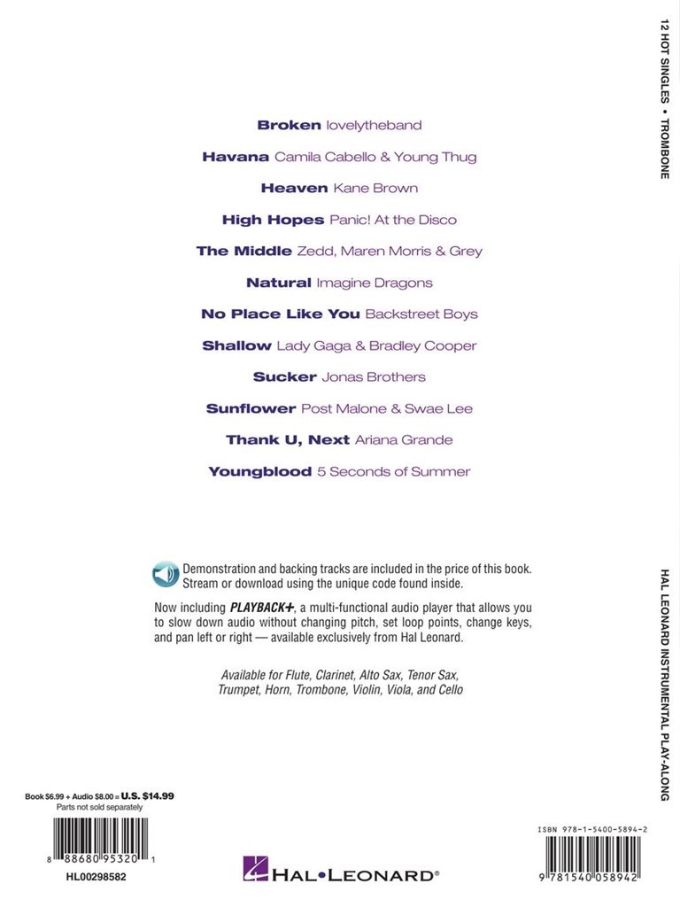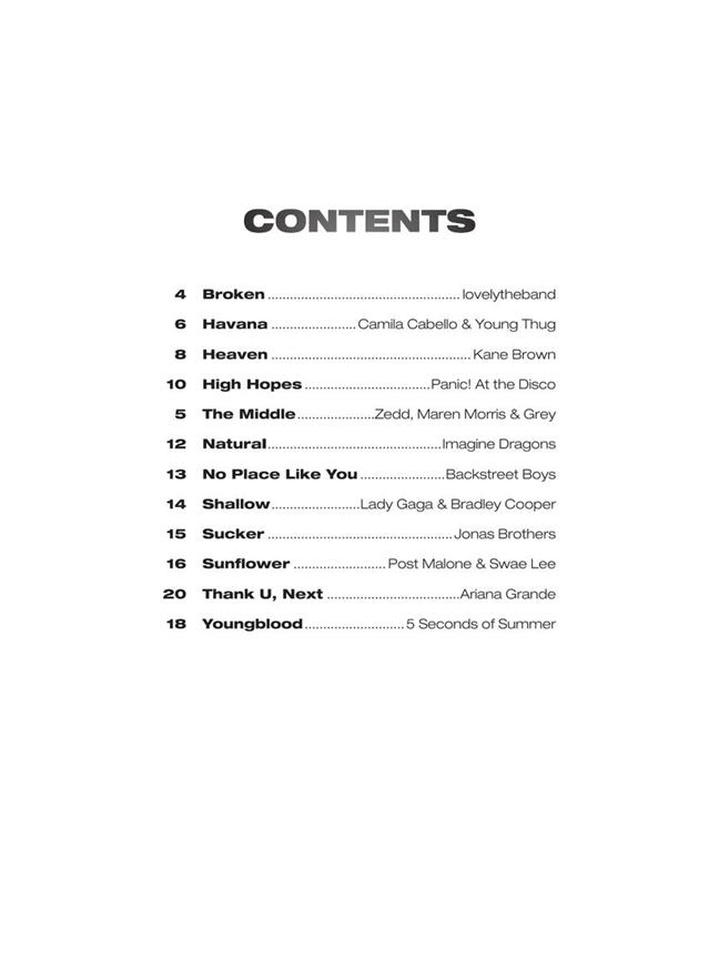 A dozen contemporary hits are included in this collection perfect for budding instrumentalists. It features online access to audio demonstration and backing tracks for download or streaming to help you hear how the song should sound then play along and sound like a pro! Songs include: Broken (lovelytheband) · Havana (Camila Cabello) · Heaven (Kane Brown) · High Hopes (Panic! At the Disco) · The Middle (Zedd, Maren Morris and Grey) · Natural (Imagine Dragons) · No Place like You (Backstreet Boys) · Shallow (Lady Gaga and Bradley Cooper) · Sucker (Jonas Brothers) · Sunflower (Post Malone and Swae Lee) · thank u, next (Ariana Grande) · Youngblood (5 Seconds of Summer).