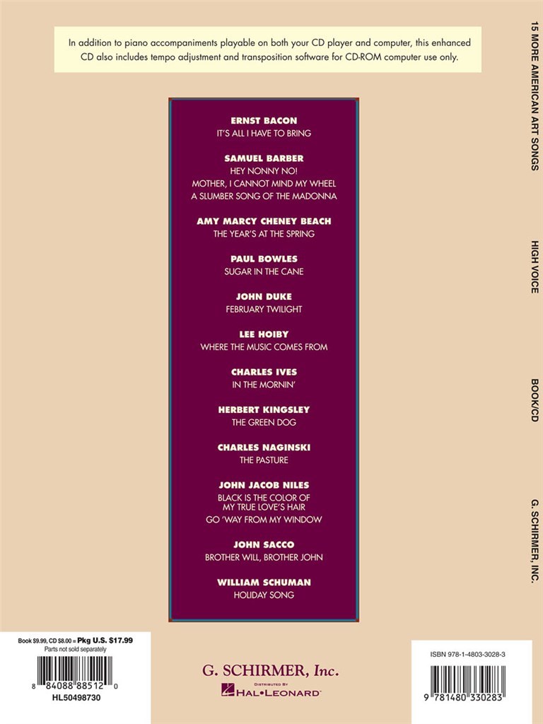 15 Plus américaines Chansons d'art (High Voice) propose une excellente sélection de chansons d'art pour les chanteurs d'étudiants, y compris des chansons de Barber, Plage, Duke, Hoiby, Ives, Niles, Schuman et d'autres.