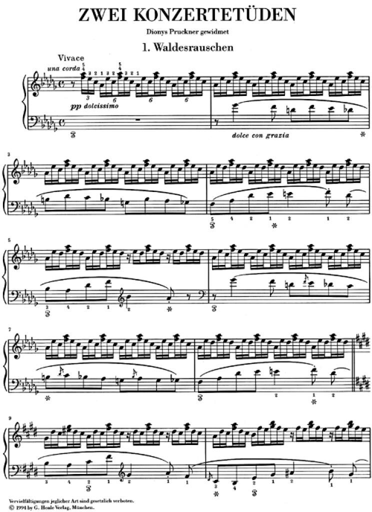 Difficiles sur le plan technique, les études «Waldesrauschen» (Murmures de la forêt) et «Gnomenreigen» (Ronde des lutins) furent composées tardivement à une période où l’on ne s’attend pas à de telles pièces virtuoses. En effet, Liszt les composa en 1862 à Rome et elles furent destinées à la Große theoretisch-praktische Klavierschule (Grande méthode théorique et pratique de piano) de Siegmund Lebert et Ludwig Stark. Il honora par là une promesse de longue date. Liszt officiait entretemps comme professeur au sein d’une grande communauté d’élèves. Il dédia ces deux études parues aussi hors de cette méthode en 1863 à son brillant et talentueux élève Dionys Pruckner qui, à l’instard’autres élèves de Liszt, les joua fréquemment en concert.