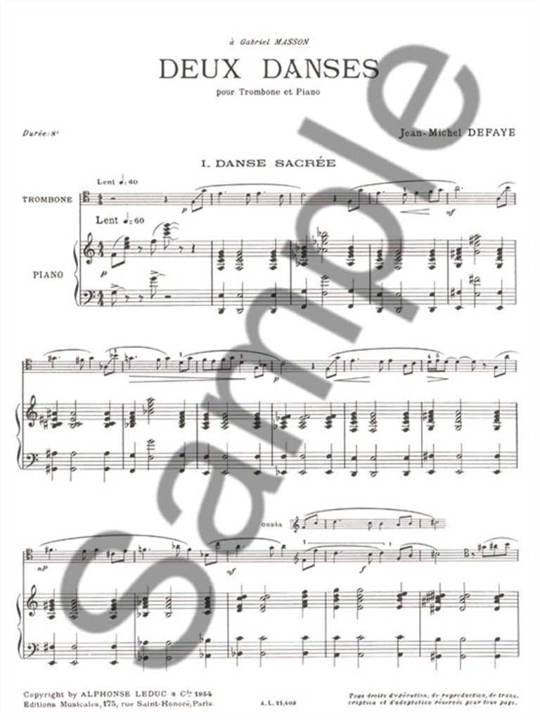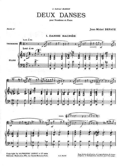 Composed by Jean-Michel Defaye in 1954, Deux Danses is the piece that put him under the international spotlight. Written for Trombone and Piano, it quickly became standard for the Trombone repertoire and would fit advanced players' skills. The first part, called ; Danse Sacree, is a slow lyrical melody that is re-used through the piece until the cadenza and the second, ; Danse Profane, has a samba rhythm with a really cheerful end. These two pieces both contain some basics of Jazz. As a pianist, composer, producer and arranger, Jean-Michel Defaye mainly createdpieces for brass and wind instruments. He won the Premier Second Grand Prix de Rome in 1958 and the Belgian Queen Elizabeth composition competition in 1959.