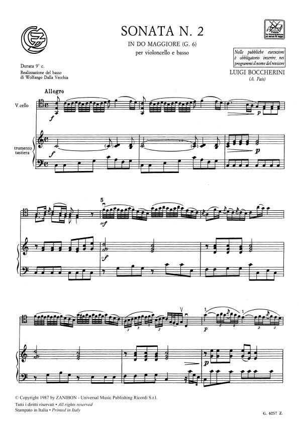 2 Sonate Per Violoncello E Basso N. 2 In Do Maggiore (G. 6) BOCCHERINI LUIGI