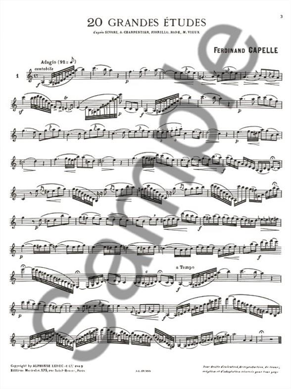 Composed by Ferdinand Capelle, this Vingt Grandes Etudes for Clarinet were written after Sivori, A, Charpentier, Rode, Fiorillo and M. Vieux. Quite difficult, they would help advanced players to master their technique and abilities and to build on the knowledge they already acquired. Each study lasts between one and two pages and they all have the approximate same level of difficulty. The book features an index table with a reference to Sivori, A, Charpentier, Rode, Fiorillo and M. Vieux to use as a guide.