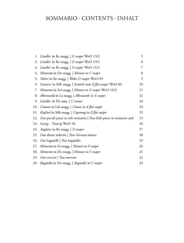 This selection of pieces spans a very long period of Beethoven's activity. Some are widely recognized, while others are much less known. Together, they constitute a short but significant introduction to the art of the Bonn genius. Each piece includes indications for pedalling and fingering.