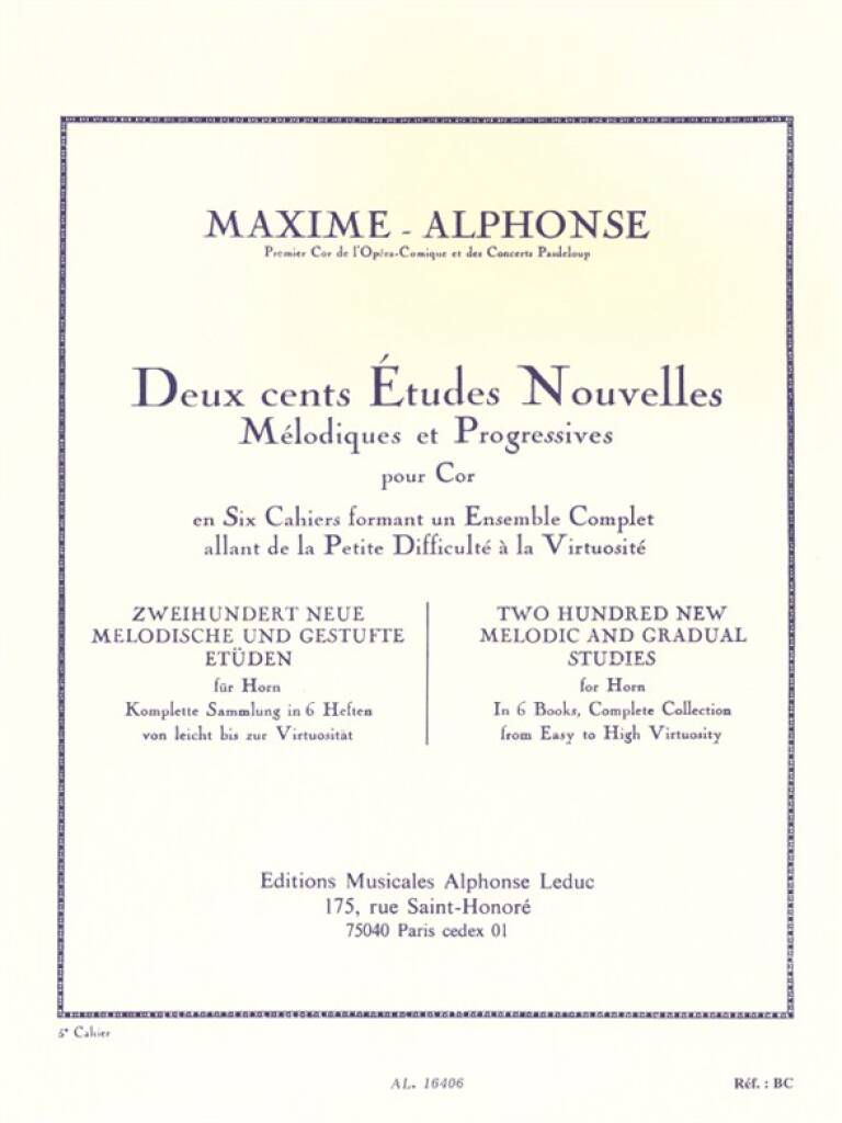Composed by Maxime Alphonse (Jean Marie Maximin François Alphonse, known as Griet, 1880-1930), Two Hundred New Melodic And Gradual Studies is the fifth book of a set of six, containing 200 etudes for Horn with different levels of difficulty. The level of this fifth book is rated as very difficult and contains 20 studies. As a Horn teacher who had also won the Premier Prix in Horn at the Paris Conservatoire, Maxime Alphonse wrote this set progressively to ensure that the content was matching the needs for quality studies, starting with pieces for beginners, and evolving through the books to thosefor advance students. Even though little information can be found about the composer, this set of six books is essential to play contemporary Horn and is widely used in the USA and in Italy.