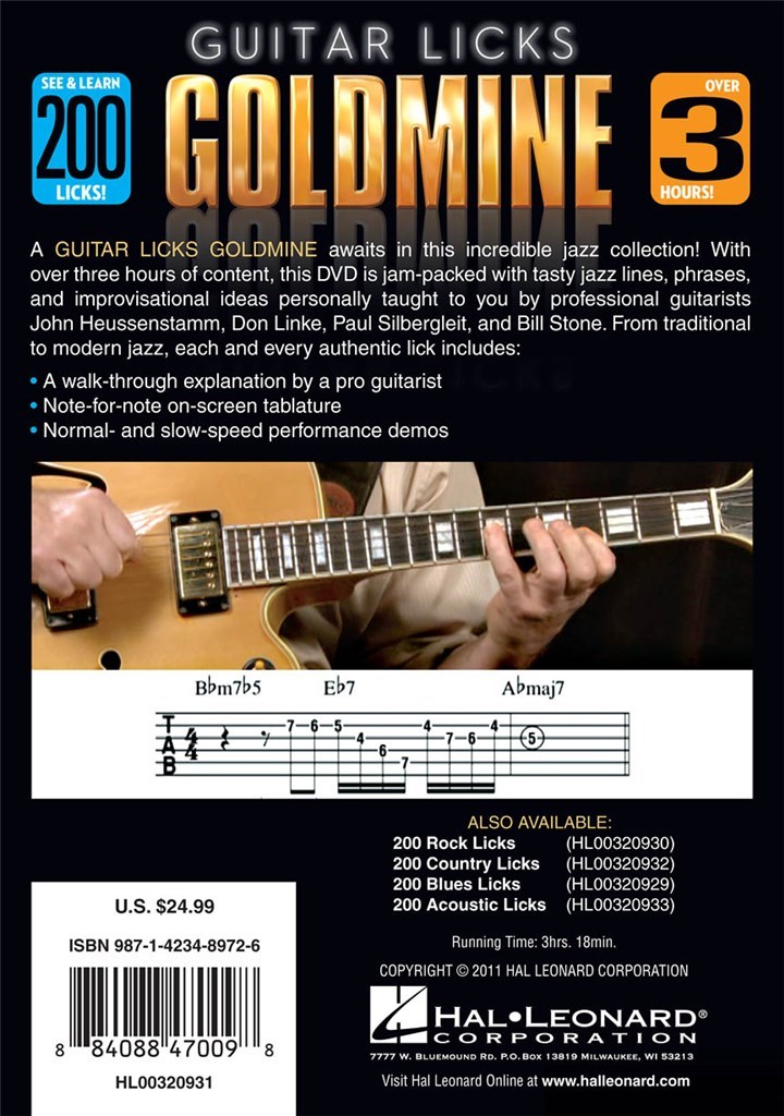 Une mine d'or Guitar Licks attend dans cette collection de jazz incroyable! Ce DVD est plein à craquer avec des lignes de jazz savoureux, des phrases et des idées d'improvisation personnellement enseigné à vous par les guitaristes professionnels John Heussenstamm, Don Linke, Paul Silbergleit, et Stone Bill. Du traditionnel au jazz moderne, chaque authentiques lèchent comprend: un rendez-vous grâce à des explications par un guitariste pro, note pour note sur la tablature à l'écran- démos des performances normales et à vitesse lente. 3 heures, 18 minutes.