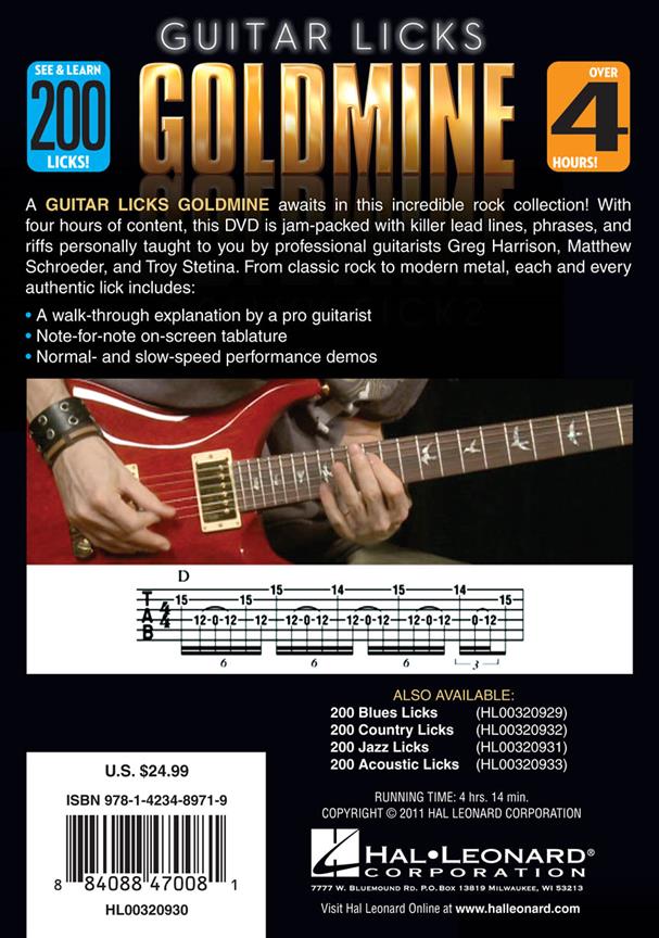 Une mine d'or Guitar Licks attend dans cette collection de roches incroyable! Ce DVD est plein à craquer avec des lignes mènent tueuses, des phrases, et des riffs personnellement enseigné à vous par les guitaristes professionnels Greg Harrison, Matthew Schroeder, et Troy Stetina. Du rock classique au métal moderne, authentique chaque lèchent comprend: une explication de plain-pied grâce par un guitariste pro, note pour note sur la tablature à l'écran- démos des performances normales et à vitesse lente. 4 heures, 14 minutes.