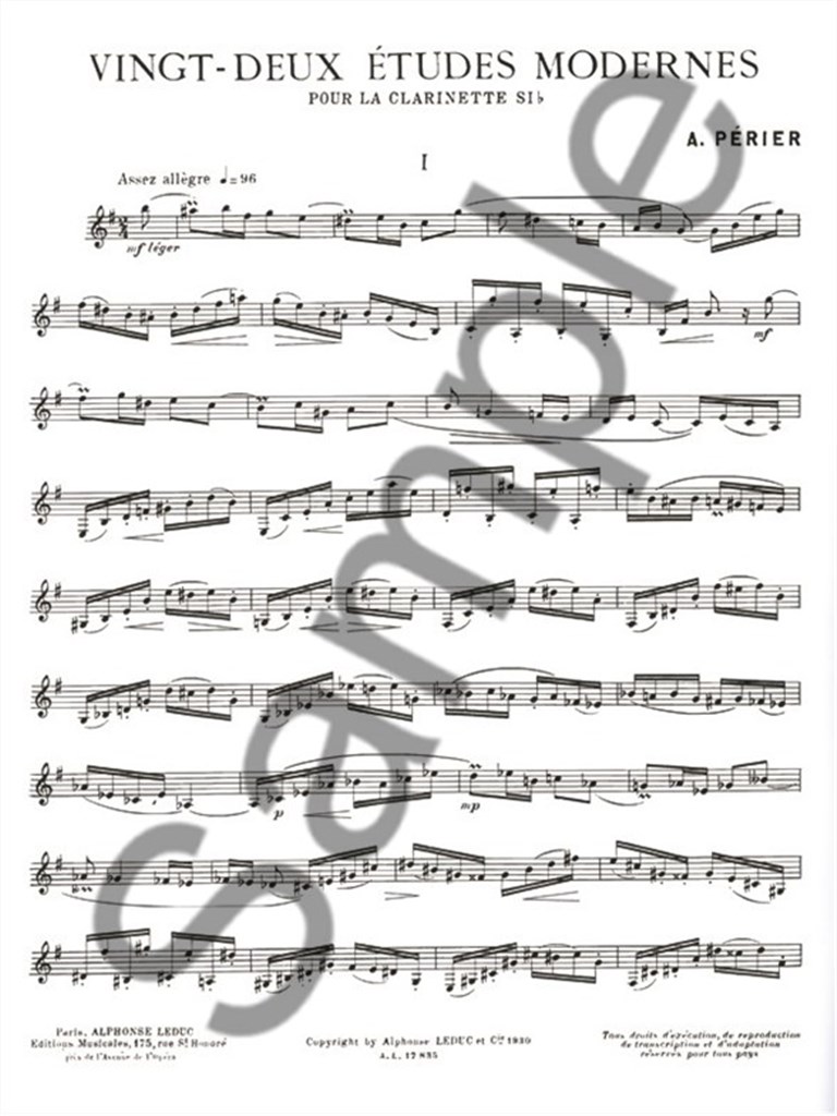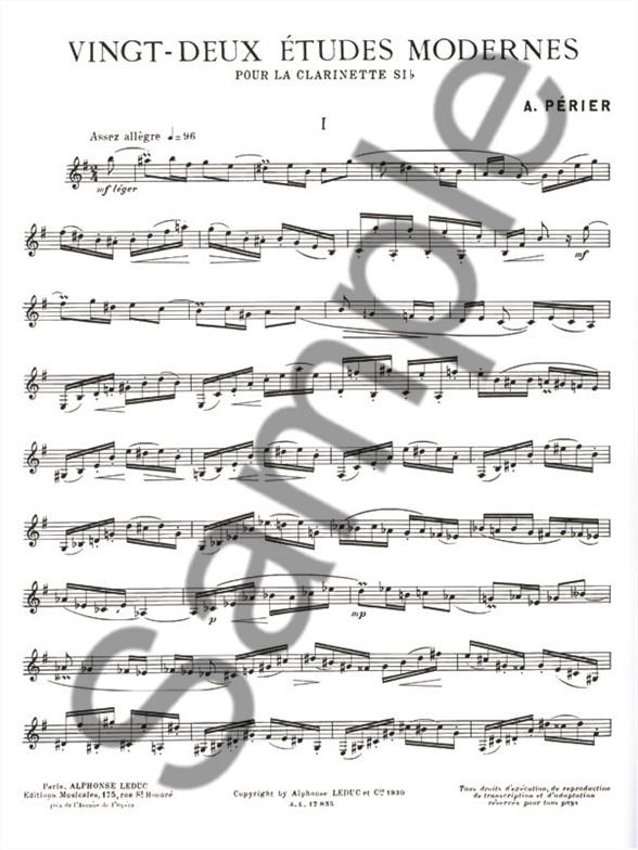 Born in southern France, Auguste Perier (1883-1947) studied at the Ecole Nationale de Musique in Montpellier before entering the Paris Conservatoire. Whilst studying, he won the 1904 first prize for Clarinet, proving his significant ability on the instrument. Therefore, his Complete Study of the Clarinet is very well-informed. The ninth volume of the series, 22 Modern Studies is suitable for clarinetists of grades seven and eight standard. Whilst addressing modern tonality and rhythmic elements, 22 Modern Studies also addresses features including articulation, dynamics, scales, arpeggios, accidentals, ornamentation, performance directions, tempo markings, phrasing, key and time signatures, and complex rhythms, among other aspects. Perier 's Complete Study of the Clarinet (22 Modern Studies) is essential to advanced clarinetists seeking to improve their technique for performances of modern repertoire to a high standard.