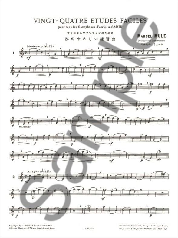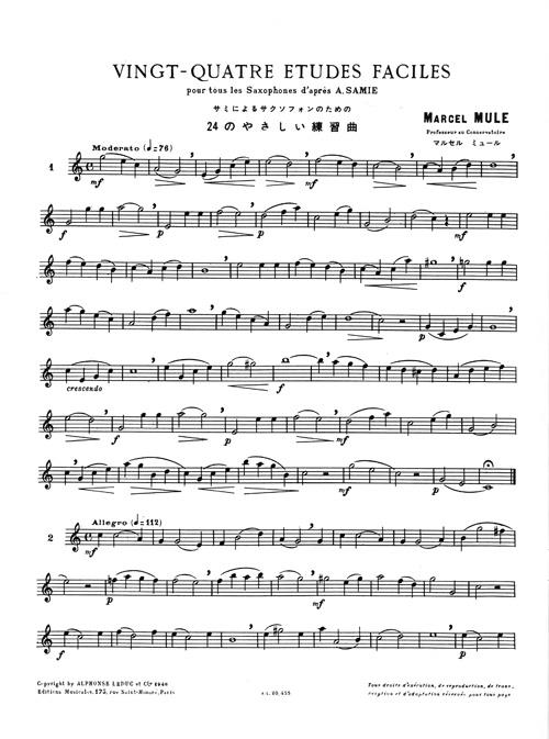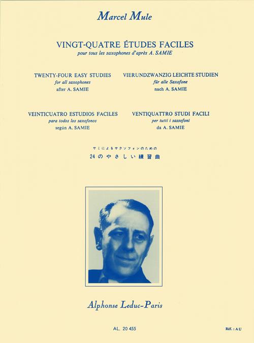 Vingt-quatre etudes faciles by Marcel Mule (1901-2001) is a set of 24 exercises for all Saxophones based on the works of Auguste Samie, a French violinist. Made for second and third year players, this material is really accessible and easy to play. Marcel Mule (1901-2001) is one of the greatest French saxophonists, renowned worldwide for his work on the classical Saxophone repertoire. He was teaching his students how to obtain a good quality of sound and believed it was dependent on the embouchure, the emission, the mastery of vibrato and therefore of breathing. He wrote different methods that focus on technique, articulation and tone productions such as 'Dix-huit Exercices ou Etudes', 'Exercices Journaliers d'après Terschack' or '30 Grands Exercices ou Etudes d'après Soussmann' (in two books), among others.