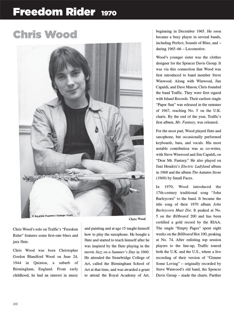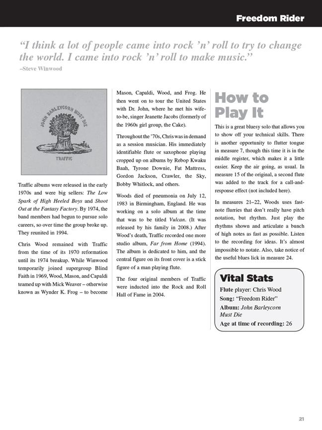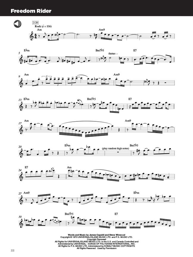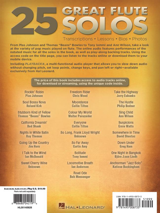 From Plas Johnson and Thomas Beans Bowles to Tony Iommi and Ann Wilson, take a look at the variety of pop music played on flute. The online audio features performances of the notated music for all the solos in the book, as well as play-along backing tracks. Songs include: Rockin' Robin (Plas Johnson) · Stubborn Kind of Fellow (Thomas Beans Bowles) · California Dreamin' (Bud Shank) · Everyone (Collin Tilton) · Solitude (Tony Iommi) · Locomotive Breath (Ian Anderson) · Road Ode (Bob Messenger) · Sing Child (Ann Wilson) · Somewhere in Time (David Shostac) · One Night in Bangkok (Björn J'son Lindh) · Anchorman Jazz Solo (Katisse Buckingham) · and more. Audio is accessed online using the unique code in each book and can be downloaded or streamed. The audio includes PLAYBACK+, a multi-functional audio player that allows you to slow down audio without changing pitch, set loop points, change keys, and pan left or right - available exclusively from Hal Leonard.