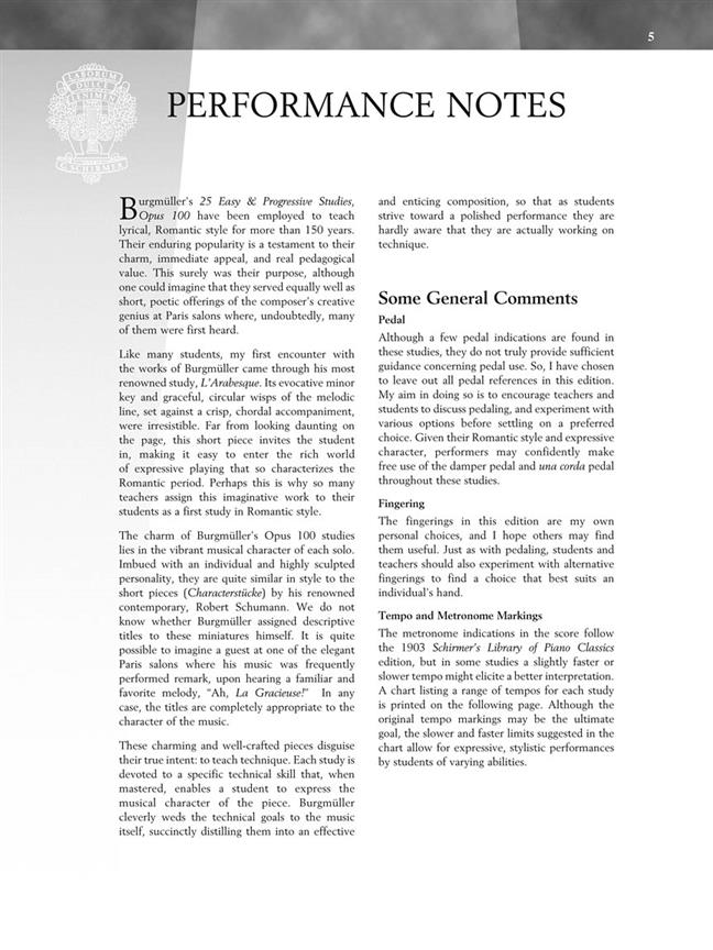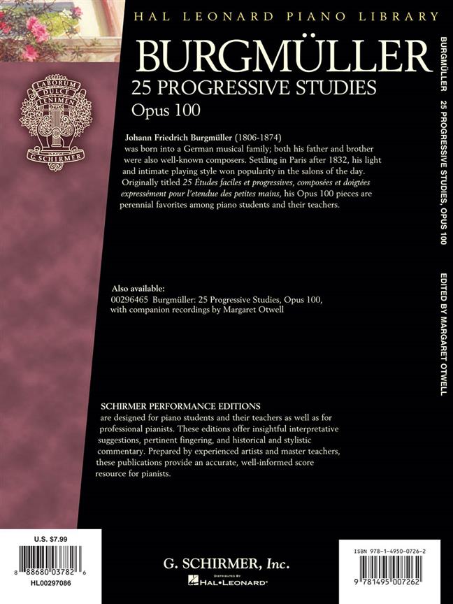Johann Friedrich Burgmüller (1806-1874) was born into a German musical family- both his father and brother were also well-known composers. Settling in Paris after 1832, his light and intimate playing style won popularity in the salons of the day. Originally titled '25 Etudes faciles et progressives, composées et doigtées expressément pour l'entendue des petites mains', his Op. 100 pieces are perennial favorites among Piano students and their teachers.