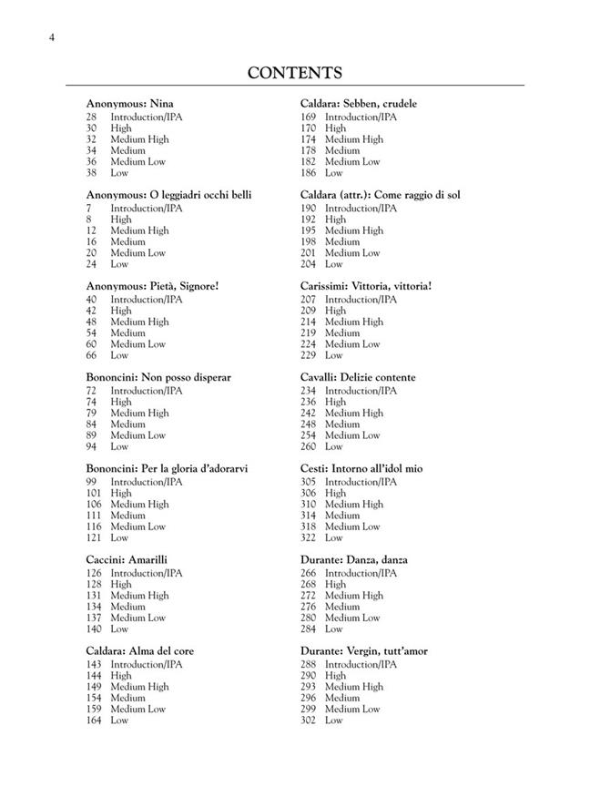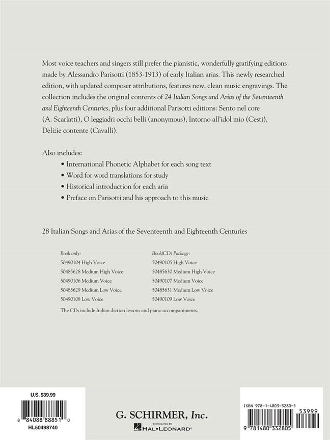 Most voice teachers and singers still prefer the pianistic, wonderfully gratifying editions made by Alessandro Parisotti (1853-1913) of early Italian arias. This newly researched edition, with updated composer attributions, features new, clean music engravings. The collection includes the original contents of 24 Italian Songs and Arias of the Seventeenth and Eighteenth Centuries plus four additional Parisotti editions. Also includes international phonetic alphabet for each song text, word for word translations for study, historical introduction for each aria, and a preface on Parisotti and his approach to this music. This compilation includes the High, Medium High, Medium, Medium Low, and Low editions in one book, perfect for teacher reference.
