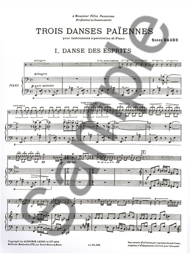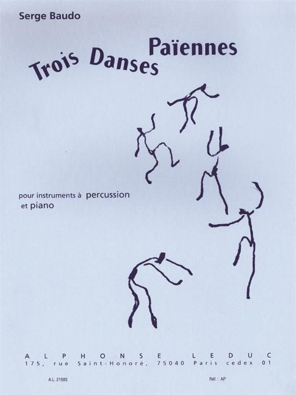 Trois Danses Paï ennes by Serge Baudo is a piece for Drums and Piano accompaniment written for the Paris Conservatoire contest. Dedicated to Felix Passerone, a professor at the Conservatoire, the pieces requires some advanced skills and technique and a good knowledge of all the instruments involved. The three pieces are: 1. Danse des esprits / Spirits danse & Allegro: Timpani, Vibraphone/ Marimba/Xylophone and Drums 2. Danse des ombres et du feu / Shadows and fire danse - Andante: Vibraphone/Marimba 3. Bacchanale / Bacchanale & Allegro Vivace: Timpani and PiccoloTimpani Serge Baudo is a French conductor, who later became the director of the Lyon National Orchestra. He also conducted orchestras in Italy and in Czech Republic.