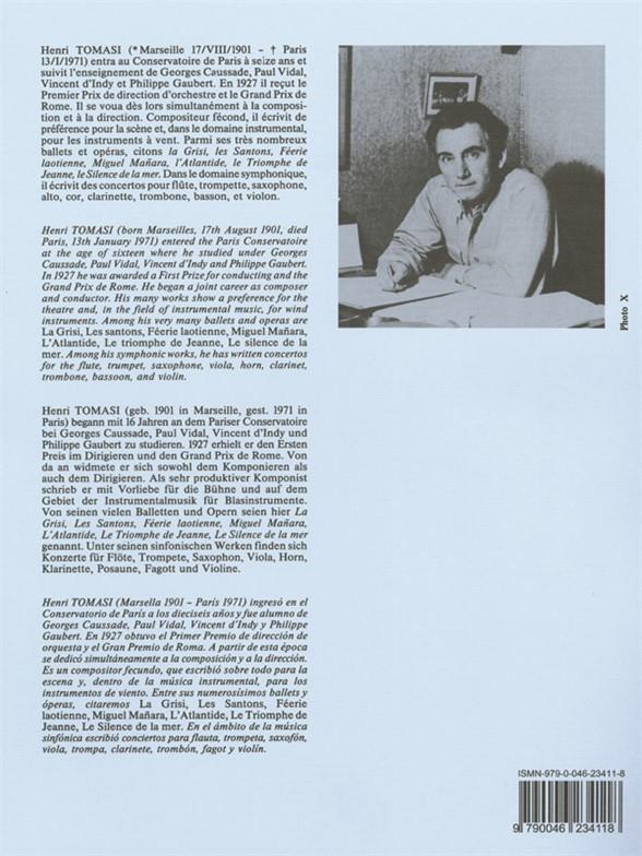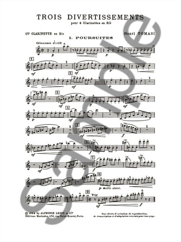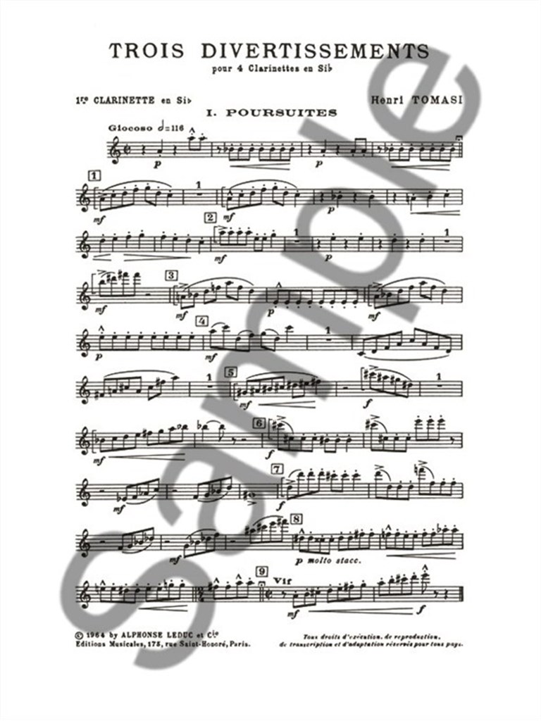 French composer and conductor, Henri Tomasi (1901-1971) published Three Divertissements for Clarinet Quartet in 1964. As with his other wind compositions, Three Divertissements was well-received by audiences. Tomasi was born in Marseille, but his Father and Mother were originally from La Casinca in Corsica. Despite being pressured into musical studies by his parents, Tomasi dreamed of becoming a sailor, and during the summer, he stayed with his Grandmother in Corsica where he learnt traditional Corsican songs. However, in 1921, he began his studies at the Paris Conservatoire and went on to become ahigh profile composer and conductor. Tomasi did not forget his Corsican routes, often incorporating themes of the songs he had learnt during the summers with his Grandmother into his compositions. The Three Divertissements are named; 1) Proceedings, 2) Masquerade, and 3) Rounds. This Tomasi piece is suitable to an advanced Clarinet Quartet, providing an exciting alternative addition to the ensemble repertoire.