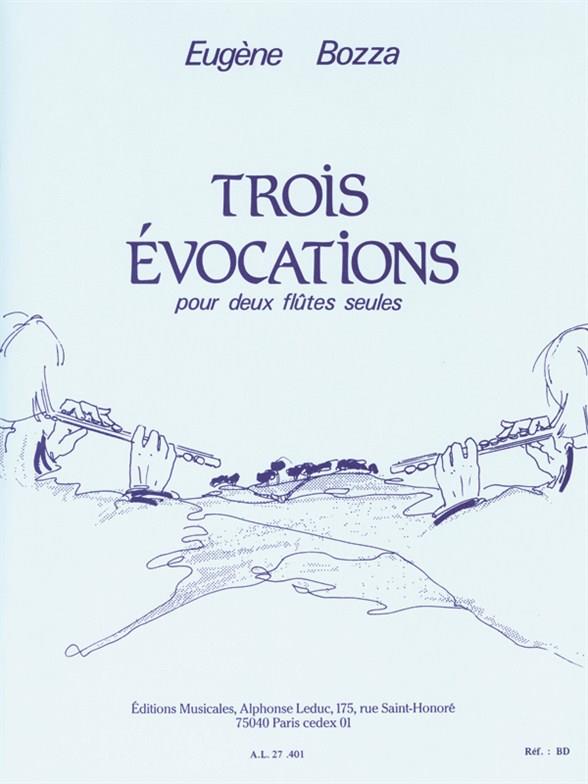To this day, Eugène Bozza (1905-1991) remains one of the most prolific composers for wind instruments, despite being a violinist himself. His Three Evocations for 2 Flutes is an exquisite addition to the repertoire. During his studies at the Paris Conservatoire, Bozza won prizes for Violin, conducting and composition, as well as the Grand Prix de Rome. He then conducted the orchestra of the Opera-Comique and became Head of the Conservatoire in Valenciennes, whilst remaining a prominent composer. Bozza 's Three Evocations are exciting duets containing much musical variation andcontrast, suitable for advanced flautists. As music educationalist Paul Griffiths has written of Bozza 's compositions, 'his works reveal melodic fluency, elegance of structure and a consistently sensitive concern of instrumental capabilities. '