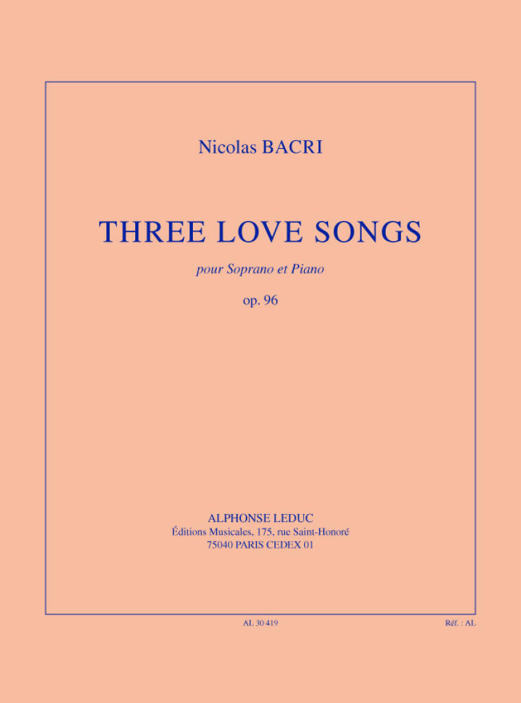 Three love songs, op. 96 (13') transcription de d. tchesnokov pour soprano et piano. Par Bacri aux éditions Leduc. Partition / Livre de chansons pour Piano et voix