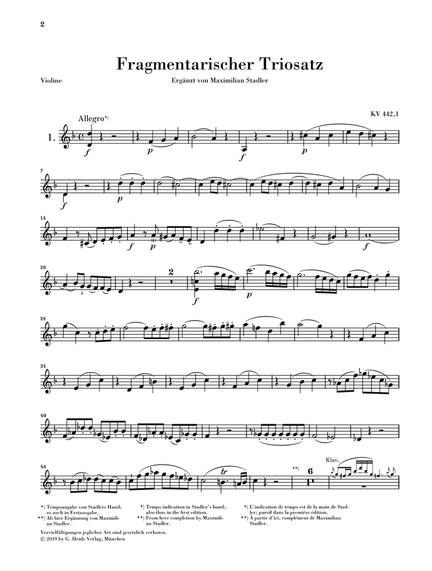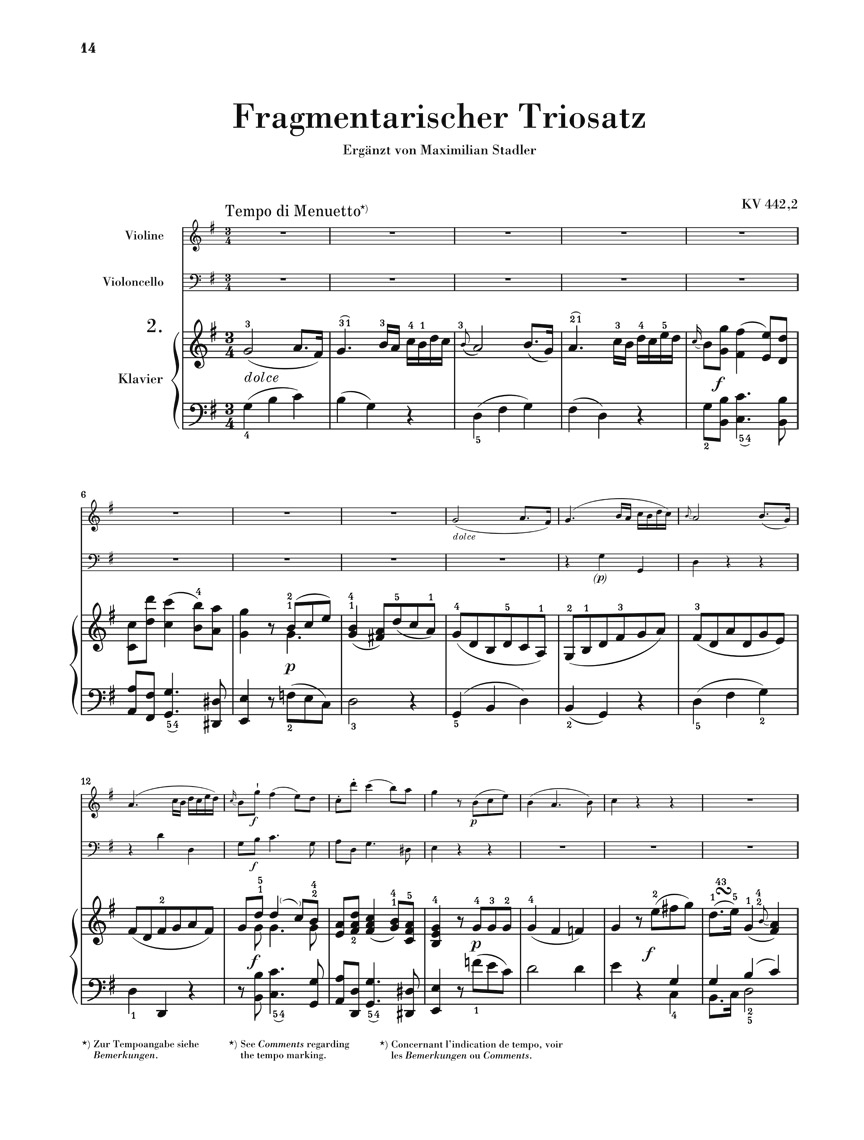 Mozart often began work on a composition only to put it aside, unfinished. Some of these fragments contain wonderful music, as is proved by these three Piano trio fragments. Mozart composed them at different times as individual movements, though the posthumous first edition brought them together as a supposedly new and unknown Piano trio by the composer, and on this basis they were given the number “442” in Köchel’s catalogue. The first edition used completions by Mozart ’s friend Abbé Maximilian Stadler that were stylistically correct but possessed little originality. This Henle Urtext edition offers both these versions andnewly-composed, highly rewarding completions by Robert D. Levin.