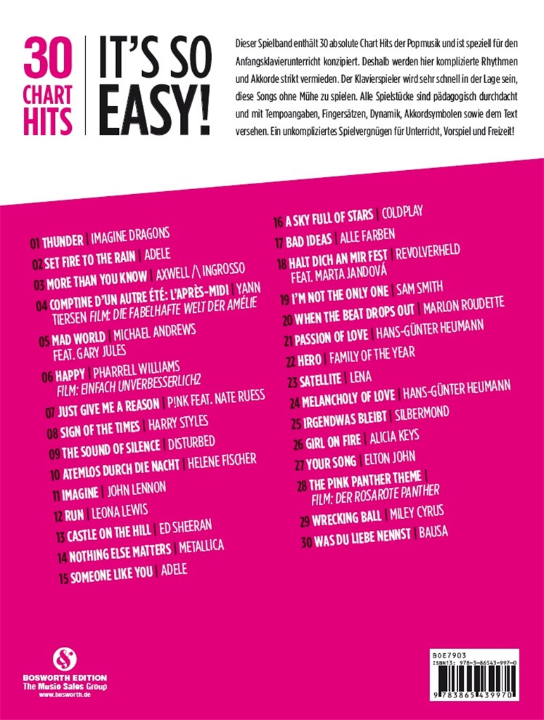 Bei It's so easy! ist der Name Programm: Die superleichten Arrangements machen es dem Klavieranfänger einfach, auf dem Instrument zu starten. Dieser Spielband enthält 30 absolute Charthits der Popmusik und ist speziell fur den Anfangsklavierunterricht konzipiert. Deshalb werden hier komplizierte Rhythmen und Akkorde strikt vermieden. Der Klavierspieler wird sehr schnell in der Lage sein, diese Songs ohne Muhe zu spielen. Alle Spielstucke sind pädagogisch durchdacht und mit Tempoangaben, Fingersätzen, Dynamik, Akkordsymbolen sowie dem Text versehen. Ein unkompliziertes Spielvergnugen fur Unterricht, Vorspiel undFreizeit! Bereits ab dem ersten oder zweiten Unterrichtsjahr können problemlos Klassiker wie Imagine (John Lennon) oder Nothing Else Matters (Metallica) und aktuelle Rock- und Pophits wie Set Fire To The Rain (Adele), Thunder (Imagine Dragons) oder Wrecking Ball (Miley Cyrus) nachgespielt werden. Bei It's so easy! ist der Name Programm: Die superleichten Arrangements machen es dem Klavieranfänger einfach, auf dem Instrument zu starten. Dieser Spielband enthält 30 absolute Charthits der Popmusik und ist speziell fur den Anfangsklavierunterricht konzipiert. Deshalb werden hier komplizierte Rhythmen und Akkorde strikt vermieden. Der Klavierspieler wird sehr schnell in der Lage sein, diese Songs ohne Muhe zu spielen. Alle Spielstucke sind pädagogisch durchdacht und mit Tempoangaben, Fingersätzen, Dynamik, Akkordsymbolen sowie dem Textversehen. Ein unkompliziertes Spielvergnugen fur Unterricht, Vorspiel und Freizeit! Bereits ab dem ersten oder zweiten Unterrichtsjahr können problemlos Klassiker wie Imagine (John Lennon) oder Nothing Else Matters (Metallica) und aktuelle Rock- und Pophits wie Set Fire To The Rain (Adele), Thunder (Imagine Dragons) oder Wrecking Ball (Miley Cyrus) nachgespielt werden.