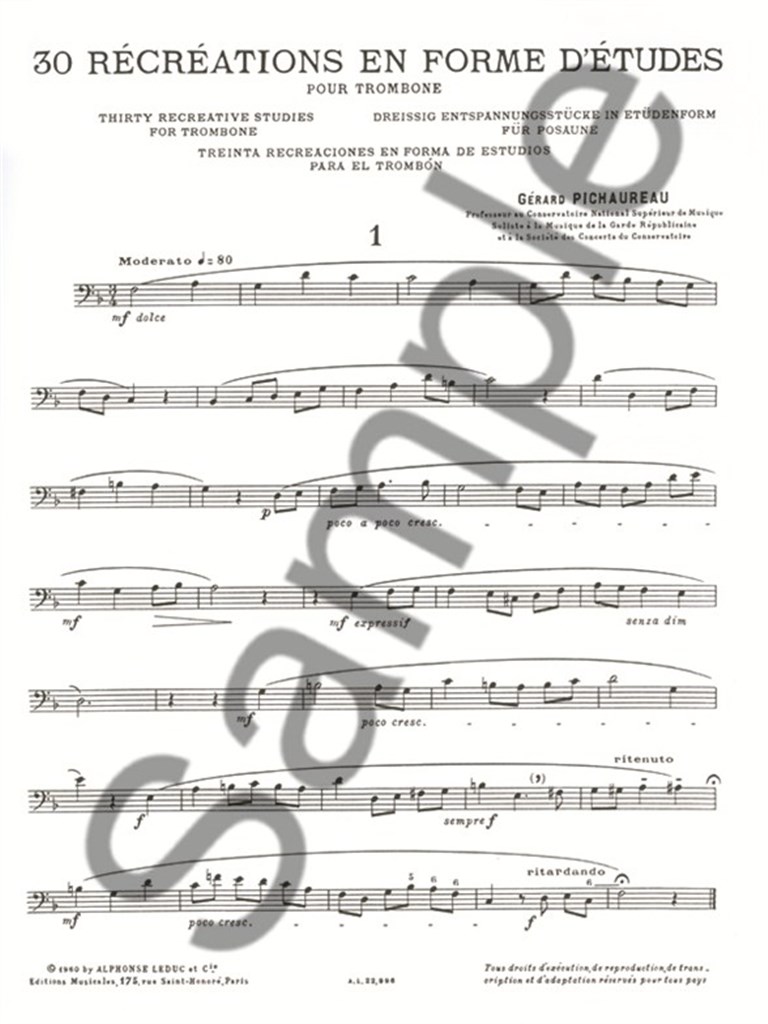 Thirty Recreative Studies by Gerard Pichaureau is a set of thirty studies for Trombone. Perfect for developing the sonority of intermediate and upper intermediate players, these recreations offer a different approach to studies and exercises, being more interesting and more cheerful than the usual sets. The length of each study varies from half a page to a full page and the book has a total of 19 pages. Born in 1916, Gerard Pichaureau is a trombonist and composer. Soloist for the French Republican Guard, he also taught Trombone at the Paris Conservatoire after Andre Lafosse.