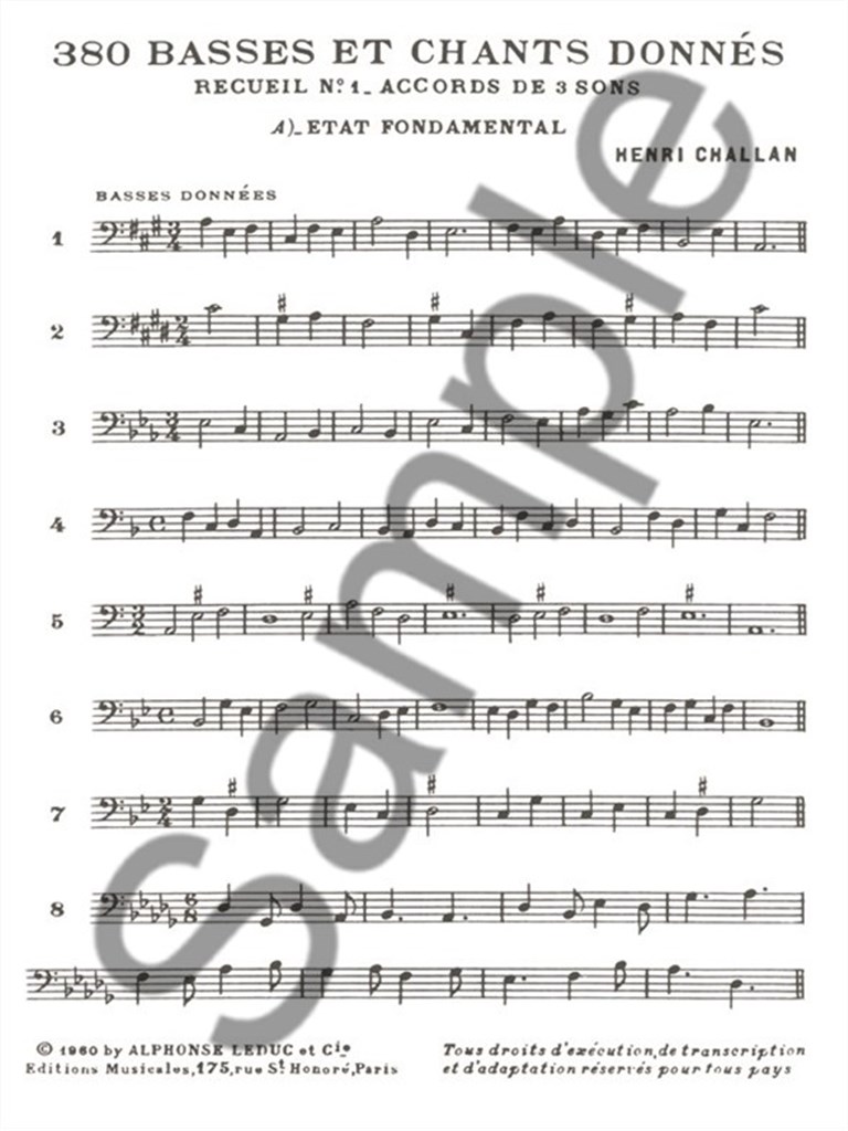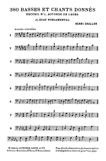 As one of the fundamentals in the study of harmony, particularly for Baroque music, Henri Challan (1910-1977) provides an imperative aid to the understanding of Figured Bass. Challan, a French composer and music educator was appointed Professor of Harmony at the Paris Conservatoire in 1936. He compiled 380 Basses Et Chants Donnes during 1960, after a considerable amount of time working in the field. With Challan 's experiences in mind, 380 Basses Et Chants Donnes is very well-informed. The first volume provides 90 exercises in which the student can practice the basics ofthe realisation of figured bass. Challan 's 380 Basses Et Chants Donnes is essential to all harmony studies, given that the realisation of figured bass remains an important part of music education.
