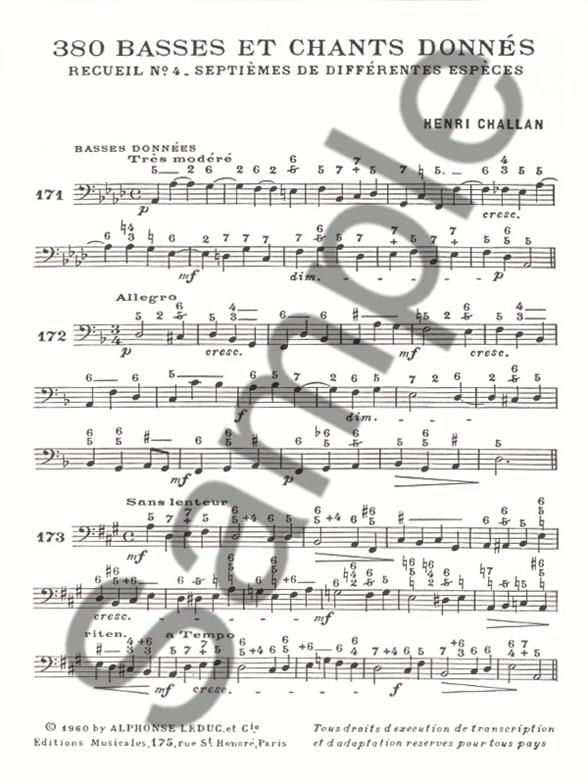 Volume 4A - Septièmes De Differentes Espèces is part of the 10 volumes of 380 Basses Et Chants Donnes by Henri Challan . This series of pieces for Voice should complete all the harmony treatises and should help the singers to gain a clear and projective sound. This volume is written in F and C keys, with some accidentals. This book is completed by the volume 4b. The whole series 380 Basses Et Chants Donnes features: 1. Accords de 3 sons 2. Modulations et marches harmoniques 3. Septièmes de dominante 4. Septièmes de differentes espèces 5. Neuvièmes de dominante 6. Ensemble des accords & alterations 7. Retards et appogiatures 8. Broderies & notes de passage & pedals 9. Basses sur l'ensemble des notes etrangères 10. Chants sur l'ensemble des notes etrangères All these volumes feature a minimum of two aspects: a. Textes, b. Elements realisateurs and for the volumes 9 and 10, c. Realisations de l'auteur Henri Challan (1910-1977) was a French composer and professor at the Paris Conservatoire
