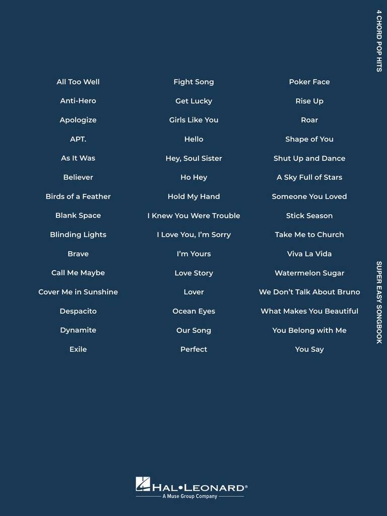 Hal Leonard, the world's most trusted name in sheet music, brings you an effortless way to enjoy the greatest songs of all time. Super Easy Piano books make it simple for anyone to sit down and play, with right-hand melodies, letter names inside each note, basic left-hand chord diagrams, and no page turns to slow you down. Plus, lyrics are included so you can sing along! This must-have collection features 45 of today's top hits that each use only four chords! Songs include: All Too Well · Apologize · Apt. · Birds of a Feather · Blinding Lights · Brave · Despacito · Fight Song · Get Lucky · Hello · Hey, Soul Sister · Ho Hey · I Love You, I'm Sorry · I'm Yours · Love Story · Perfect · Poker Face · Shape of You · Shut up and Dance · Someone You Loved · Stick Season · Take Me to Church · Viva La Vida · Watermelon Sugar · What Makes You Beautiful · You Say · and more. Whether you're an absolute beginner or returning to the keyboard after some time away, 4 Chord Pop Hits is an easy way to enjoy timeless music.