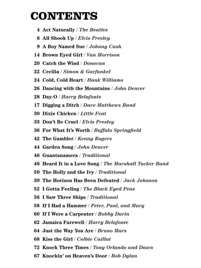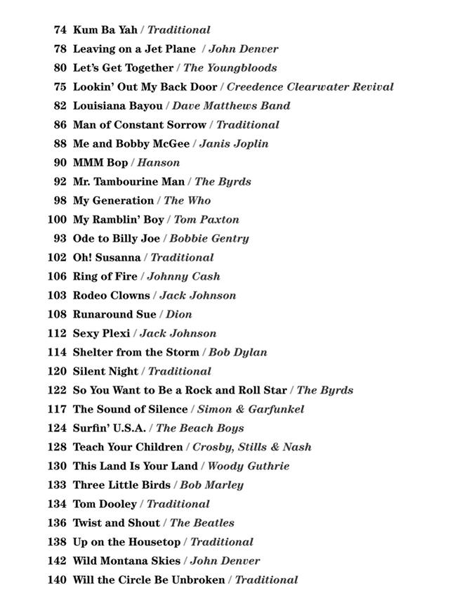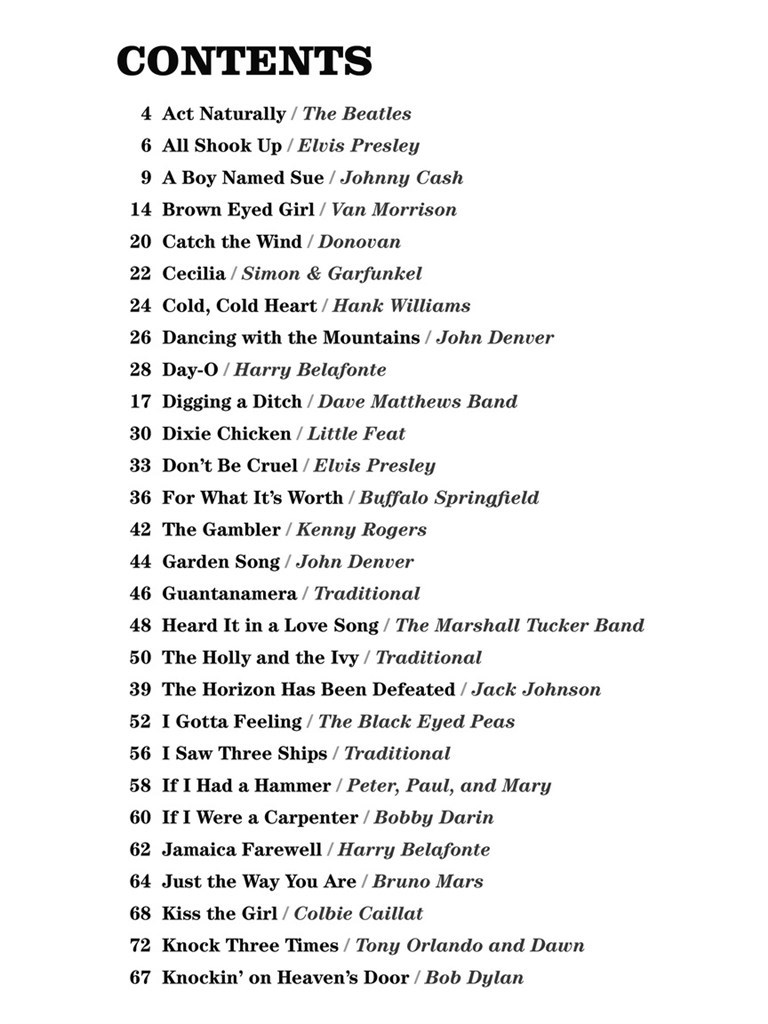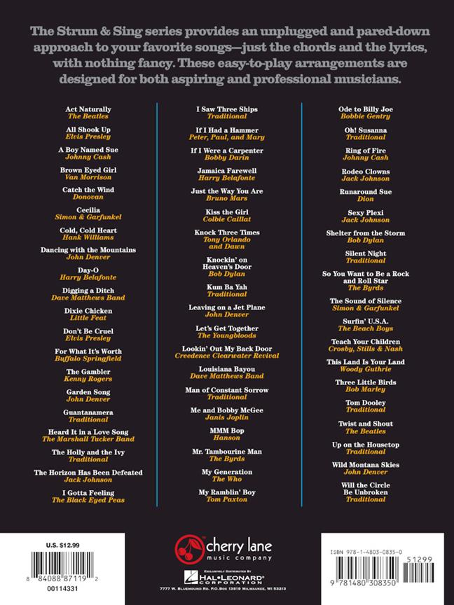 La série Strum and Sing propose une approche déconnectée et épurée de vos chansons préférées – juste les accords et les paroles, sans rien de sophistiqué. Ces arrangements faciles à jouer sont conçus aussi bien pour les musiciens en herbe que pour les professionnels. Cette collection fantastique vous permet de jouer près de 60 chansons dans de nombreux styles, en ne connaissant que 4 accords au ukulélé ! Comprend : All Shook Up - Cecilia - Dixie Chicken - The Gambler - Guantanamera - I Gotta Feeling - Mr. Tambourine Man - Ma génération - Ring of Fire - Shelter from the Storm - Surfin' U.S.A. - Twist and Shout - et des dizaines d’autres.