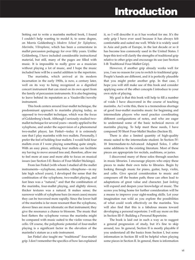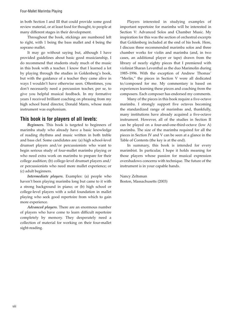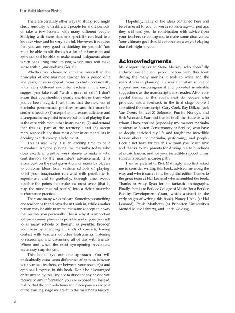 * Lignes directrices pour la sélection de maillet, la production de quatre ton maillet grip, coups,, rouleaux, collages, le phrasé, la construction d'un répertoire personnel et d'autres sujets qui sont cruciaux pour marimbiste succès d'aujourd'hui.