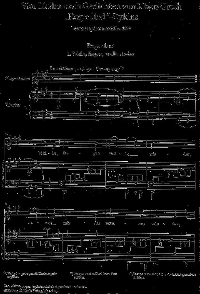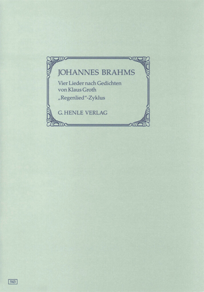 L’édition originale du «Regenlied-Zyklus» est uniquement disponible aux éditions G. Henle. Dans sa préface, le grand connaisseur de Brahms, Michael Struck, décrit la particularité de l’oeuvre, un petit cycle de lieder resté jusqu’alors totalement inconnu. Brahms y met en musique quatre textes du poète Klaus Groth qu’il tenait en grande estime. Dans le cycle de lieder op. 59 connu de tous et publié par Brahms lui-même, on retrouve les lieder de Groth, mélangés et en compagnie d’autres lieder. La raison pour laquelle la 1ère Sonate pour violon de Brahms en Sol majeur op. 78 est aussi appelée «Regenlied»-Sonate se révèle si l’on se procure, étudie et joue le «Regenlied-Zyklus».