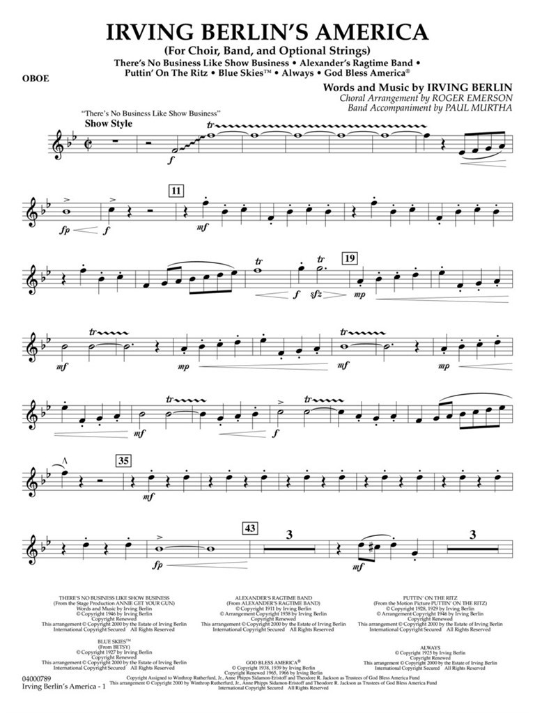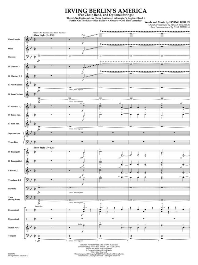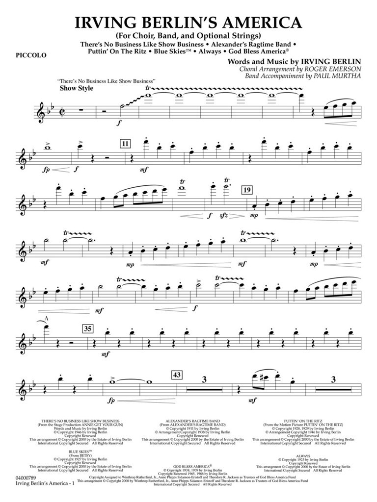 With a musical career spanning a century, the 20th century was Irving Berlin ' s own and his music was America ' s music. This spectacular choir, band and optional string medley où some où Irving Berlin ' s classic songs offers avariety où entertaining performance options. Includes: Alexander ' s Ragtime Band, There ' s No Business Like show Business, Puttin ' où the Ritz, Always, Blue Skies, Goù Bless America. Available: SATB, SAB, 2-Part, Concert Band (Gr. 3), String Pak, ShowTrax CD. Performance Time: Approx. 7: 00.