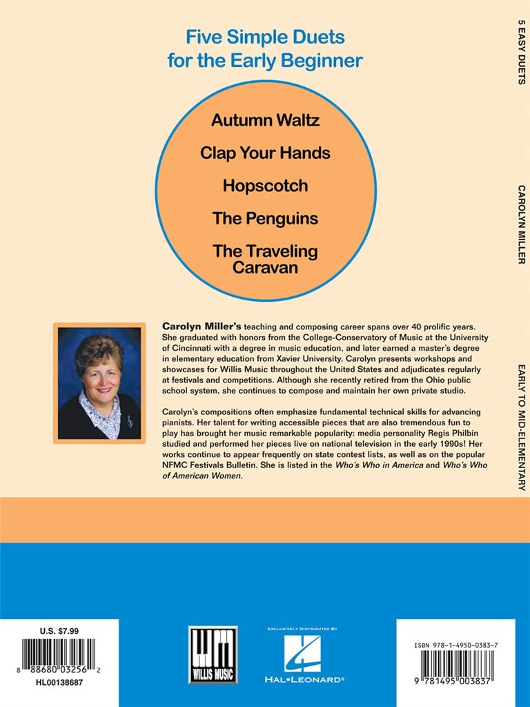 Les enfants de tous âges adoreront interpréter ces duos simples et touchants de Carolyn Miller ! Lorsque les jeunes élèves jouent en collaboration, cela encourage l’écoute et les compétences sociales dès le plus tôt niveau, et n’importe lequel de ces cinq duos faciles à voix égales contribuerait à une expérience d’ensemble merveilleuse. Titres : Tapez dans vos mains · Loupe · Valse d’automne · Les Penguins · La caravane itinérante.