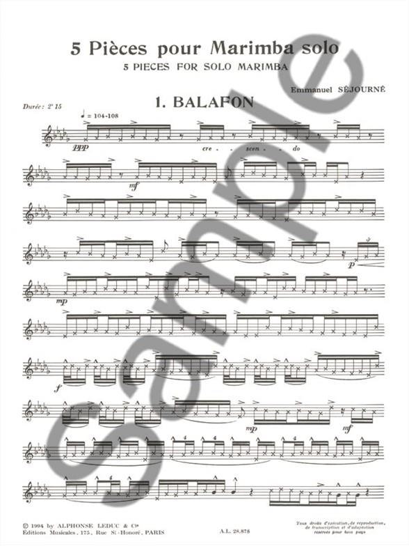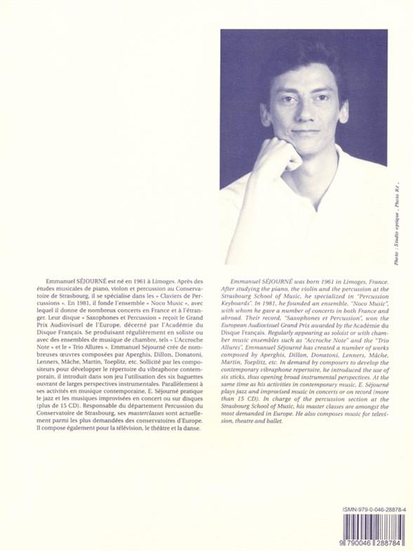 The fourth volume of a series of books for percussionists by Emmanuel Sejourne, 5 pieces for Marimba, Vol. 4 is a set of 5 works for 4 to 4. 5 Marimbas. Written for advanced level players and inspired from African rhythms, the three first compositions can be played each after the other or separately. The five pieces are: Balafon Ambira Akadinda Generalife Pretexte The names of these 5 pieces for Marimba, Vol. 4 were given after different African instruments of wooden blades that can be found in various places. While Pretexte is quite jazzy with itsstrong beat, Generalife is more dynamic and should be played with more energy and character. Emmanuel Sejourne (born in 1961) is a French percussionist and composer, who was strongly influenced by Western music and popular music. He wrote a series of books for percussionists including 'Keyboard and Percussions, Vol. 1'.