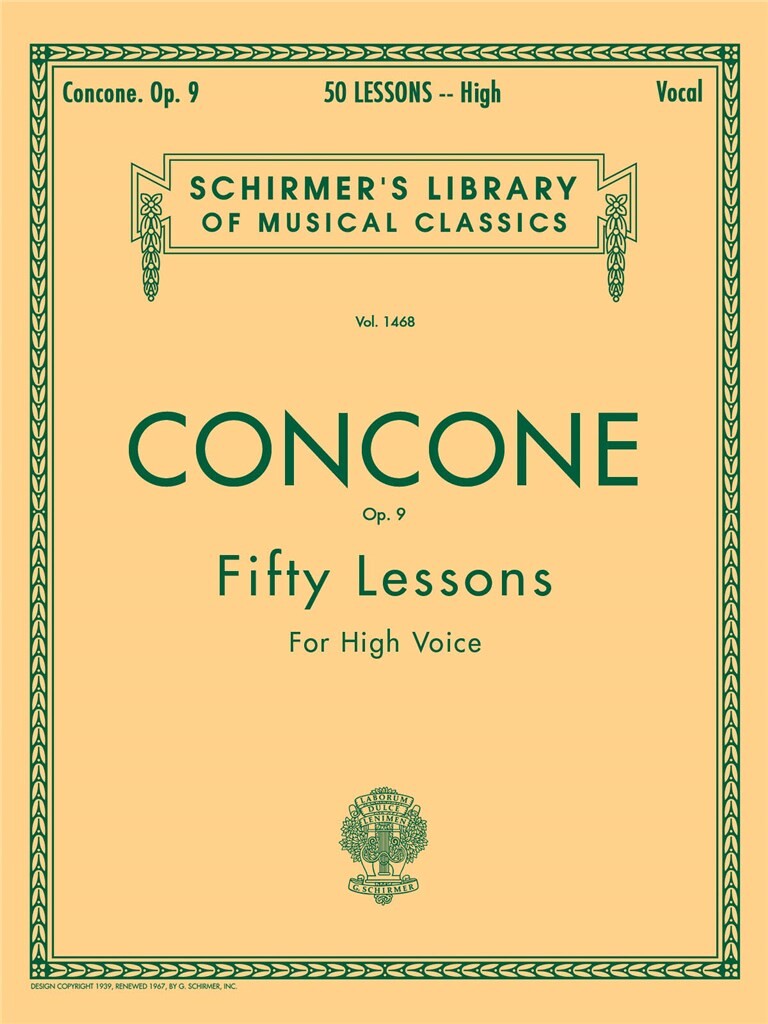 Fifty lessons for high voice. Schirmer's Library of Musical Classics. The purpose of these lessons is 'To place and fix the voice accurately', 'To develop taste while singing broad elegant and rhythmical melodies'.