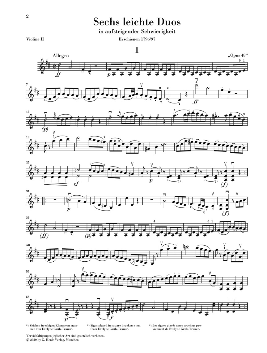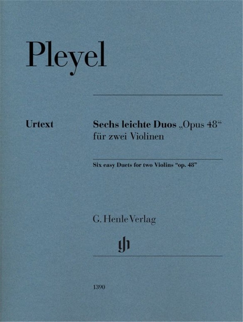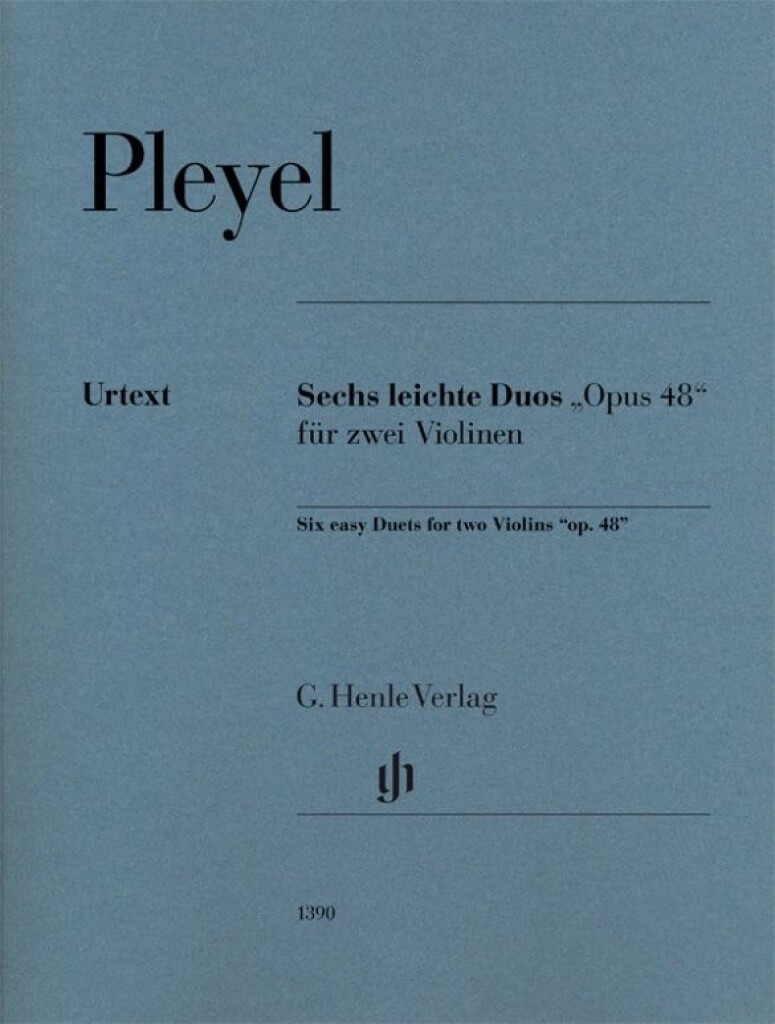 Ces duos faciles furent publiés vers 1796/97 par la maison d’édition de Pleyel à la fois sous le titre Six Duos faciles et progressives pour deux violons et sous le titre de Six nouvelles Sonatines progressives pour piano et violon, bien que nous ne sachions aujourd’hui pas quelle version fut la première. À ce jour, les duos de violon sont des favoris pour les cours de violon, mais aussi pour la création musicale à la maison. Bien que moins connu aujourd’hui, vers 1800, Ignaz Pleyel comptait parmi les compositeurs les plus populaires d’Europe occidentale – ce qui peut surprendre au début, mais à en juger par ces pièces très attrayantes, gérables pour les débutants avancés, est facilement compréhensible. Avec un score non marqué et deux parties solo marquées, l’édition Urtext offre un matériel optimal pour l’enseignement.
