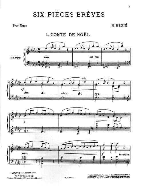 Six Short Pieces est un ensemble de courtes œuvres pour harpe composées par Henriette Renie. Écrite en deux suites pour harpe à pédales ou à levier, le volume est divisé comme indiqué ci-dessous : Suite 1 : - Conte de Noë l - Recueillement - Air de Danse Suite 2 : - Invention dans le Style ancien - Rêverie - Gavotte Cet ensemble de pièces est vraiment agréable à jouer et a été écrit pour les débutants avancés/intermédiaires. Il comprend des accords, des arpèges, quelques modifications accidentelles et quelques harmoniques naturelles. Henriette Renie (1875-1956) est une harpiste française qui avait Alphonse Hasselmans et Theodore Dubois comme professeurs au Conservatoire de Paris. Elle a reçu le premier prix pour la harpe et a composé de nombreuses pièces pour harpe, dont un concerto, quelques œuvres de musique de chambre et des transcriptions d’autres œuvres pour harpe.