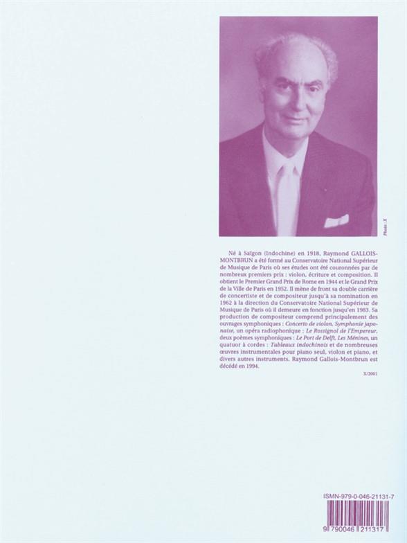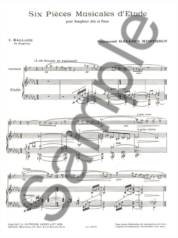 Raymond Gallois Montbrun (1918-1994) published his 6 Musical Study Pieces for Alto Saxophone and Piano in 1954, just ten years after he won the Grand Prix de Rome. Along with his Violin Concerto, 'Japan' Symphony and Concertstück for Clarinet and Piano, 6 Musical Study Pieces remains popular to this day. 6 Musical Study Pieces for Alto Saxophone is made up of six short pieces in variety of styles, each addressing a different technique. These are; 1) Ballade (flexibility), 2) Intermezzo (trills), 3) Rondo (staccato), 4) Lied (sonority), 5) Waltz (chromaticism), and 6) Finale (velocity). As suitable and varied pieces for the progression of intermediate to advanced levelsaxophonists, Gallois Montbrun 's 6 Musical Study Pieces cannot be missed.