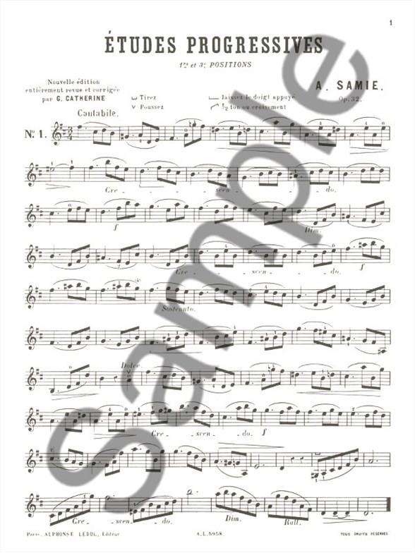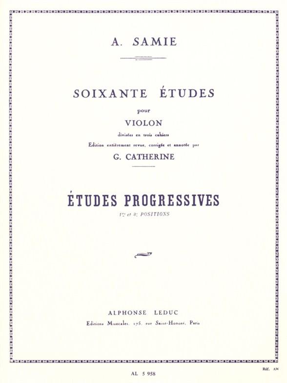 Progressive studies is the second volume of the series Sixty Studies for Violin, written by Auguste Samie and edited by G. Catherine. Containing twenty studies, this volume should help upper beginners / intermediate violinists to play with the first and third positions more naturally. An increasing difficulty can be perceived in term of rhythm and tempo. This volume is completed by 'Dainty Studies' (Volume 1) and 'Melodic Studies' (Volume 3).