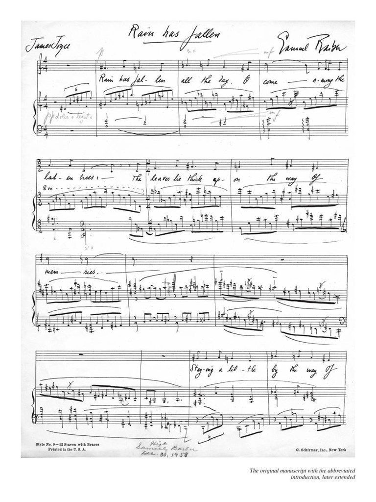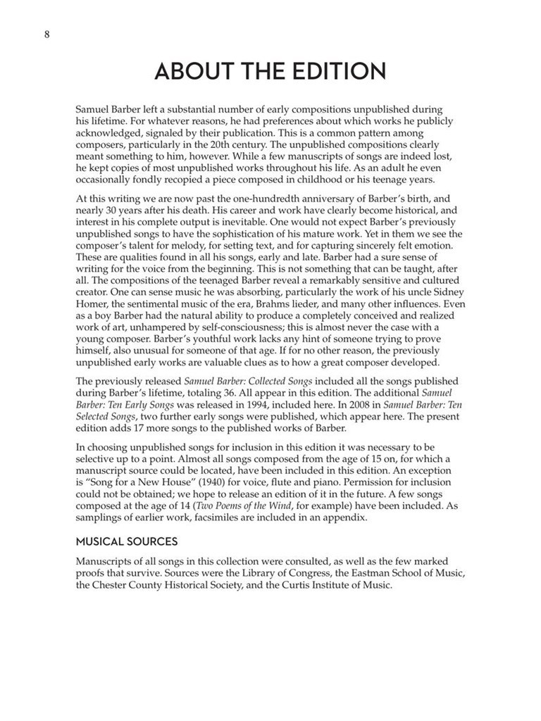Pour célébrer le 100e anniversaire de la naissance de Samuel Barber, nous sommes fiers de lancer cette importante nouvelle édition, qui comprend les éditions nouvellement édité et gravé de la totalité du contenu Collected Songs et dix premières chansons (1994), ainsi que de nombreux inédits tôt chansons. Les manuscrits de la Bibliothèque du Congrès et d'autres sources ont été consultées pour toutes les chansons. L'édition comprend de nombreuses informations historiques sur chaque chanson, un article long et pertinentes sur Barber, et fac-similés de manuscrits sélectionnés.