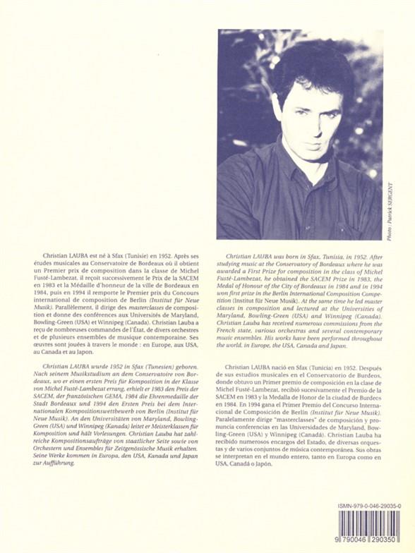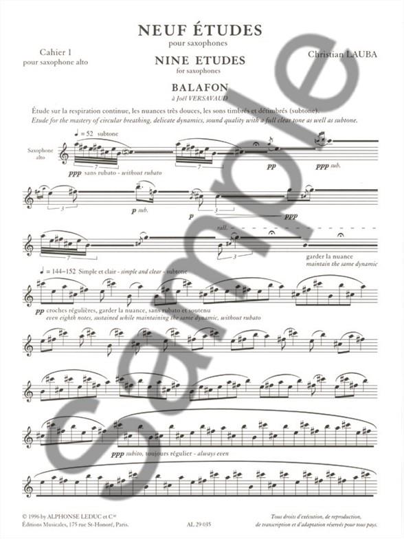 Born in Tunisia in 1952, Christian Lauba has been a prominent contemporary composer, winning many prizes since his graduation from the Conservatory of Bordeaux during the mid-1980s. Lauba is particularly noted for his compositions and teaching guides for the Saxophone, such as Nine Studies for Saxophones. Composed betweem 1992 and 1994, Nine Studies for Saxophones won Lauba the SACEM prize in composition. The first volume contains the first four studies; 1) Balafon, 2) Savane, 3) Sanza, and 4) Jungle. Nine Studies for Saxophones is very modern in style, exploiting extended techniques of the Saxophone to the maximum. These include multiphonic sounds, subtones, slap-tongue, harmonics, flutter tonguing, double tonguing, slaps and key noises. With modern classical music becoming more and more prominent within the genre, Lauba 's Nine Studies for Saxophones is essential to all saxophonists.