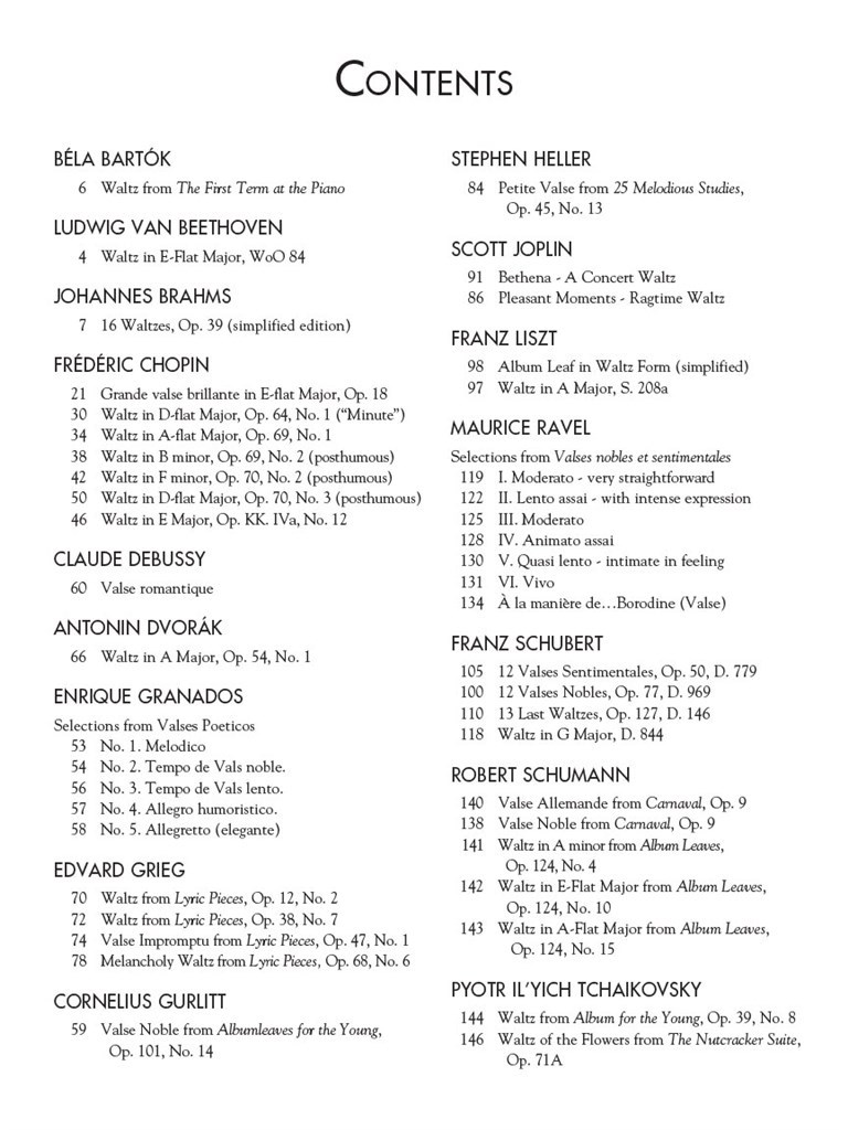 A collection of waltzes by 16 favorite composers including Brahms, Chopin, Grieg, Lizst, Ravel, Schubert, and Schumann. Highlights include Chopins Valse brillante in E-flat Major, Op. 18, and Tchaikovskys "Waltz of the Flowers.” Intermediate to Upper Intermediate Level.