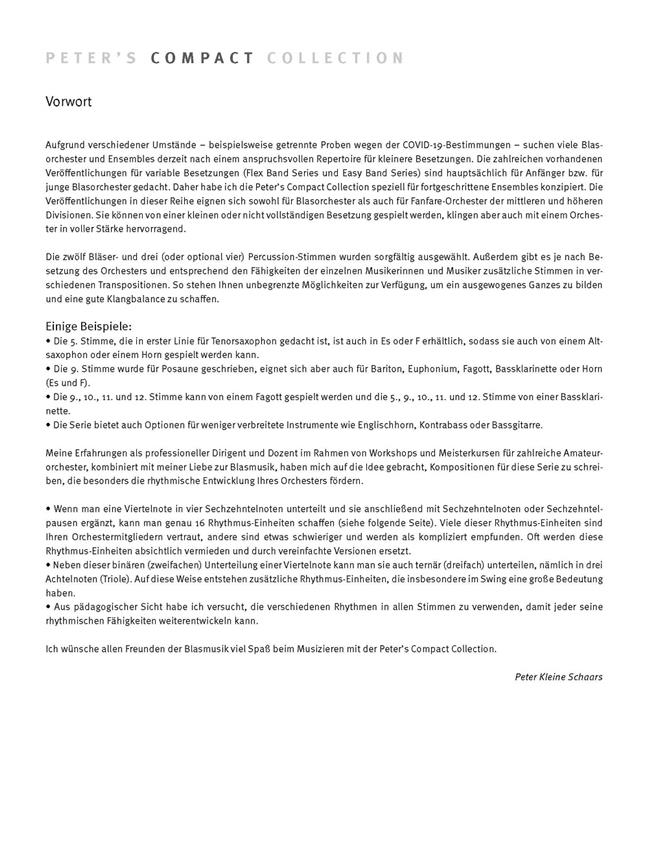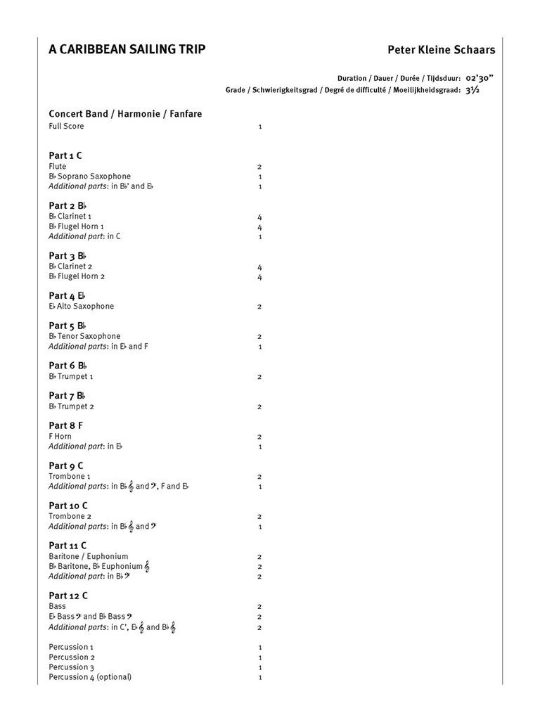 Avec cette composition de style rumba, Peter Kleine Schaars nous invite à un voyage décontracté en bateau sur les eaux des Caraïbes. Le sentiment de liberté qu’offre le voilier est dépeint par une ample mélodie dans une palette d’harmonies colorées – les teintes de l’eau –, tandis que d’habilles percussions tiennent le cap. Qui ne rêverait pas d’une telle aventure ? Bien que les thèmes et accompagnements musicaux aient été élaborés à partir de combinaisons de cellules rythmiques qui se rencontrent moins souvent, les sonorités de l’œuvre sont très naturelles et fluides. En présumant que les cellules rythmiques 1 à 8 fassent partie des compétences de base de votre orchestre, l’accent se trouve plutôt sur les cellules 9 à 13. L’instrumentation est arrangée de manière à ce que ces « nouvelles cellules » se trouvent dans toutes les parties, afin que tous les membres de l’orchestre se familiarisent avec cette évolution rythmique.