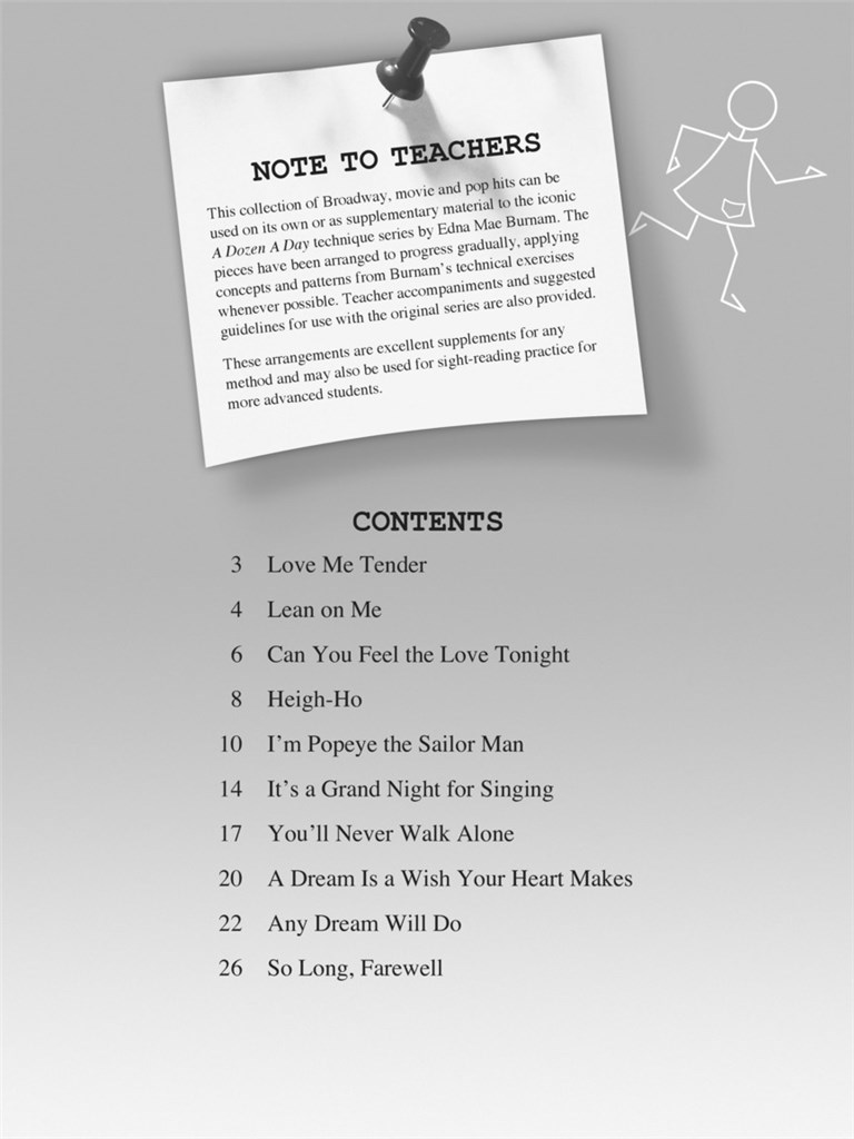 A Dozen A Day Songbook et la série lt - /strong et gt - contiennent de merveilleux succès de Broadway, de films et de pop qui peuvent être utilisés comme pièces complémentaires aux exercices techniques mémorables des séries et lt-em et gt - A Dozen A Day et lt-em et gt -. et lt - /p et gt - et lt - p et gt - également adaptés comme compléments avec n’importe quelle méthode. et lt - /p et gt - et nbsp - et lt - p et gt - Chansons dans et lt - strong et gt - A Dozen A Day Songbook : Piano - and nbsp - Mini Book/CD et lt - /strong et gt - incluent et lt - em et gt - Any Dream Will Faire, A Dream Is a Wish Your Heart Makes, et nbsp - Appuie-toi sur moi, et nbsp - You’ll Never Walk Alone et Lt - /em et gt - et et Lt - em et gt - Peux-tu sentir l’amour ce soir et Lt - /em et gt - . et lt - /p et gt -